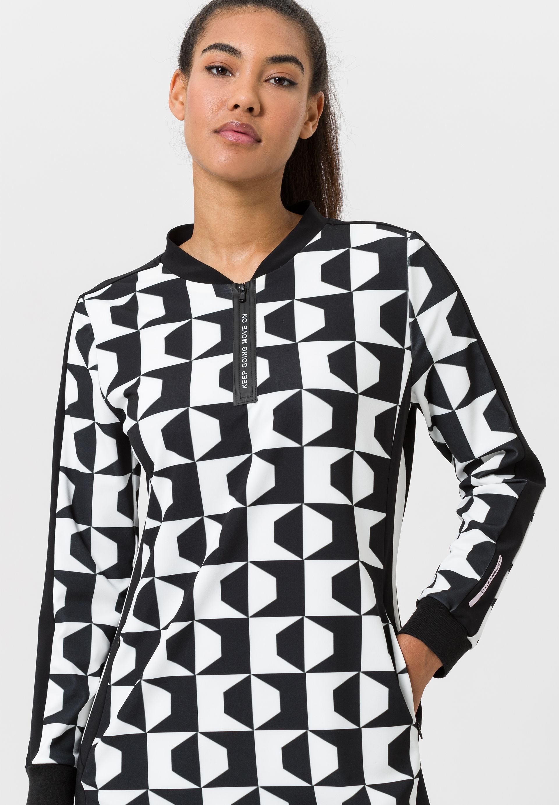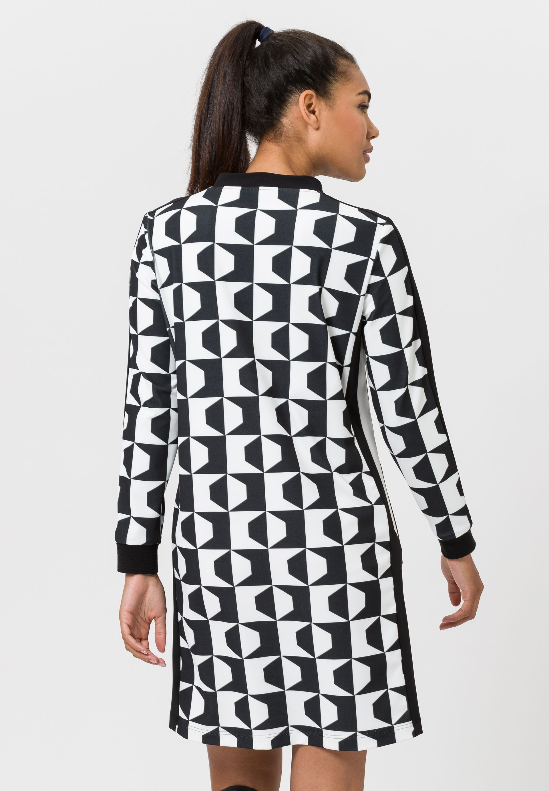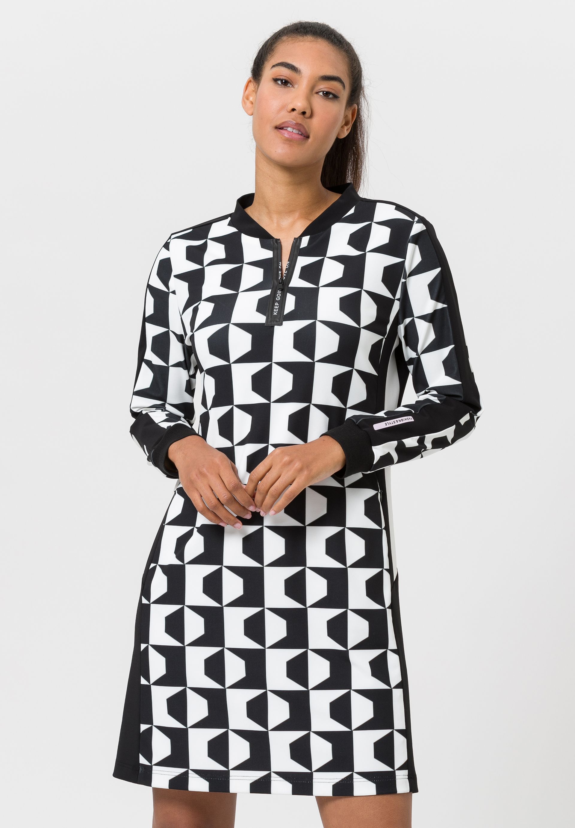На сайте указаны российские размеры. Спортивное платье – абсолютный must have для уверенных в себе женщин. От воротника-стойки до потайной молнии с мотивирующей типографской деталью, от слегка зауженного кроя до контрастного принта по всей поверхности. Маленькая, но изящная деталь: карманы в боковых швах на молнии.