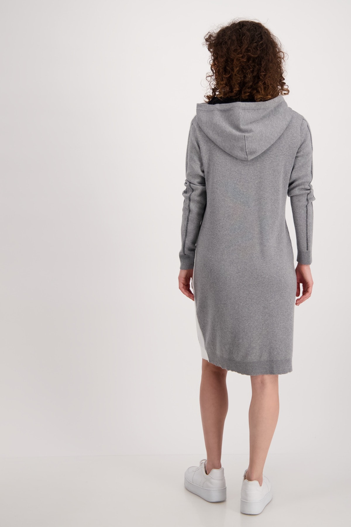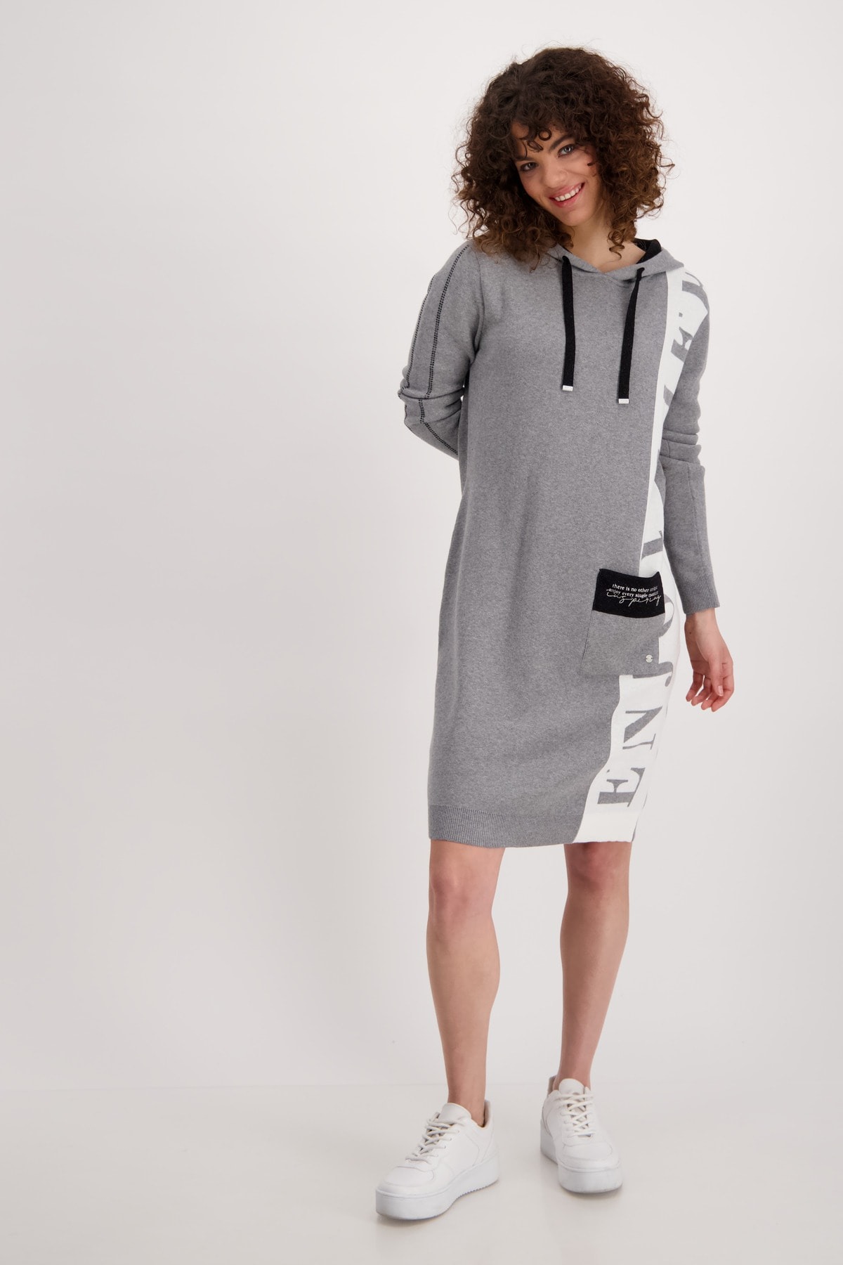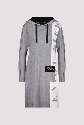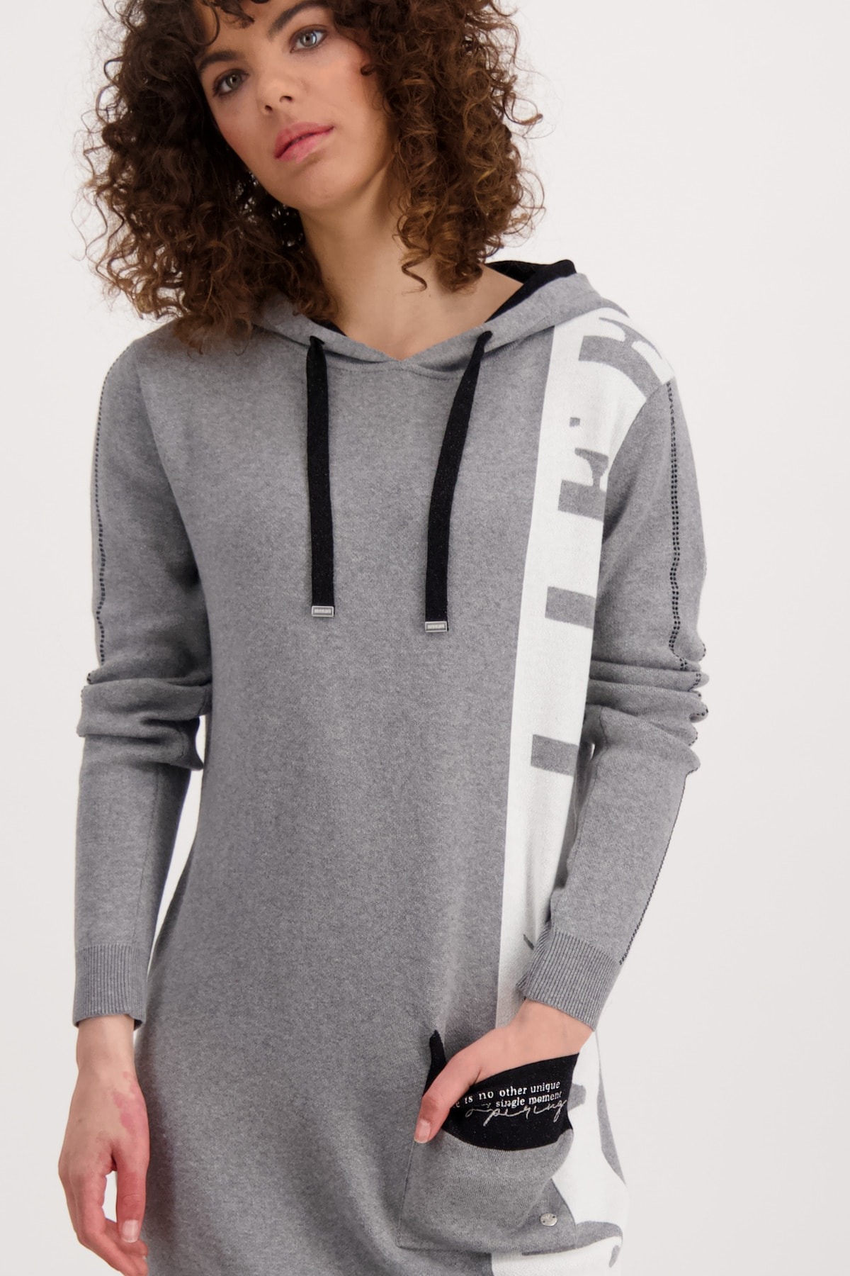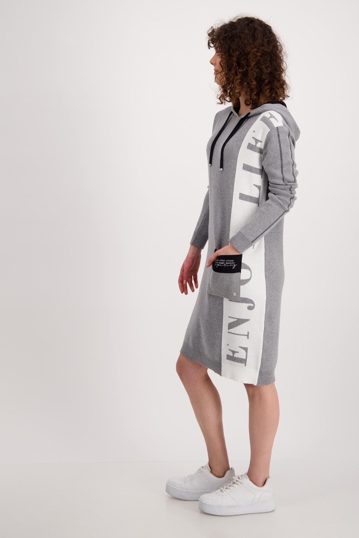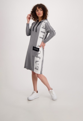 На сайте указаны российские размеры. Трикотажное платье миди с капюшоном и накладным карманом. Длина миди прямого кроя, капюшон с блестящей внутренней частью из люрекса, разделительный шов, кулиска и полосы из люрекса. Абсолютной изюминкой дизайна с цветовыми блоками является жаккард с крупными буквами на левой стороне и накладной карман с внешними швами и блестящим люрексом. Концы рукавов и низ с широкими манжетами в рубчик.
