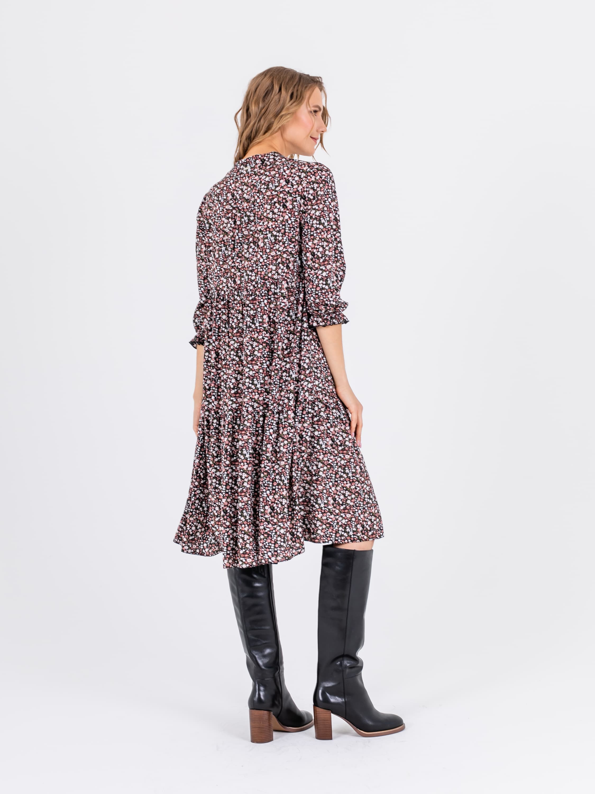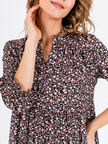 На сайте указаны российские размеры. Крой: платье свободного силуэта из гладкой вискозы в стиле бохо. Отрезное под грудью, расклешенное, имеет втачной рукав, низ которого собран на эластичную тесьму, что позволяет фиксировать его на комфортную высоту и разный объем рук. Платье состоит из двух ярусов, которые выгодное подчеркивают достоинства фигуры и изысканно маскируют недостатки. Платье подойдет женщинам разных фигур и комплекций, а в особенности будущим мамам и прекрасным обладательницам шикарных форм. Отделка: ткань в мелкий цветок создает женственный и романтичный образ, который влюбляет в себя с первого взгляда. Сочетайте с однотонными жакетами и кардиганами из ассортимента Stern. Рост модели 175 см.