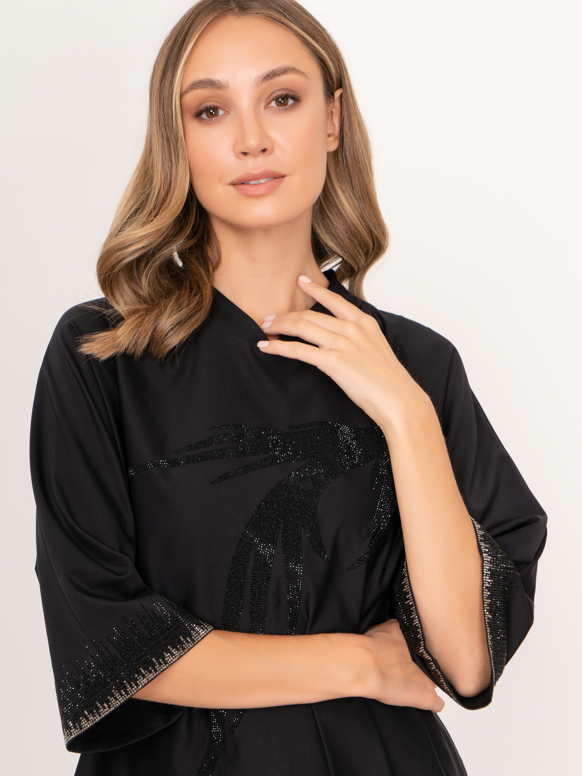 На сайте указаны российские размеры. Прямое черное миди платье с фигурным воротником, с укороченным рукавом 3/4, украшенный стразами. Платье дополняет рисунок птицы из страз. Рост модели: 175 см. Длина платья: 106 см.