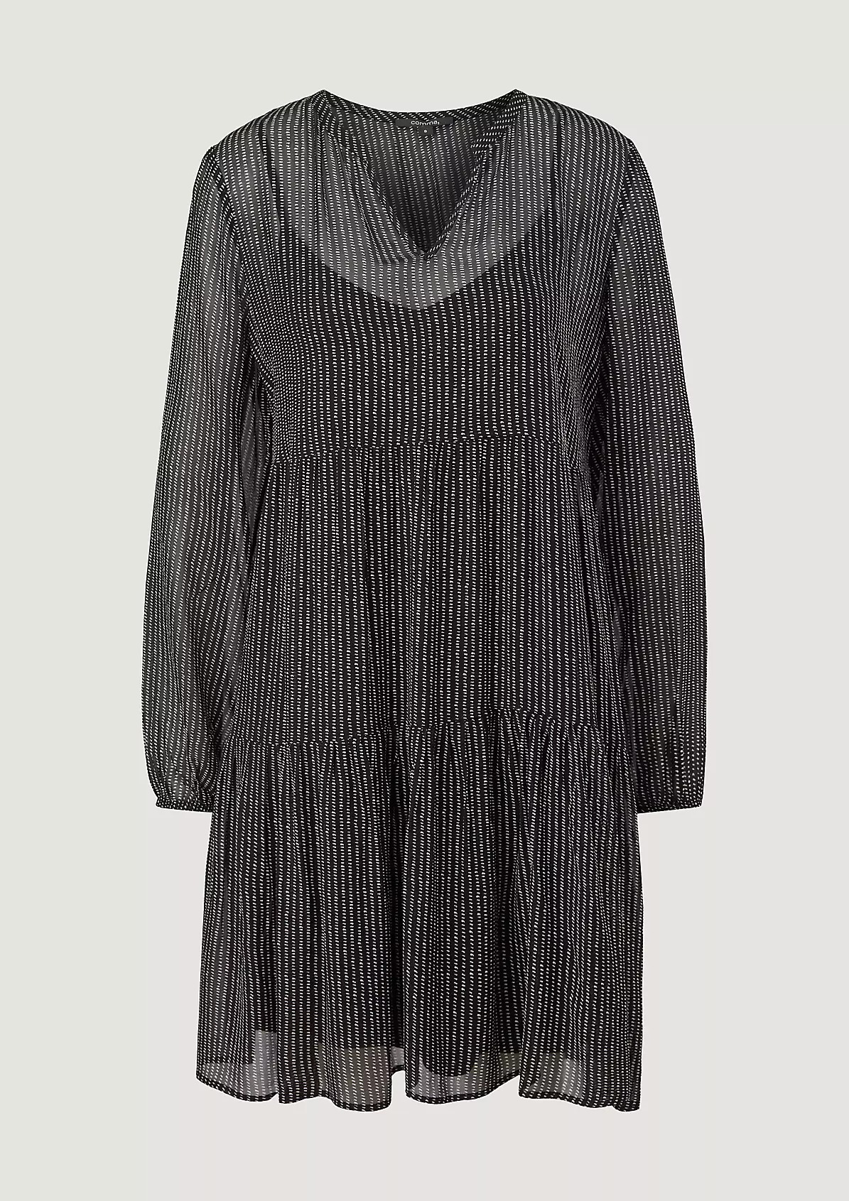На сайте указаны российские размеры. Полупрозрачное платье прямого кроя с длинными рукавами и эластичными манжетами. Длина спинки в 44 размере - 97 см.