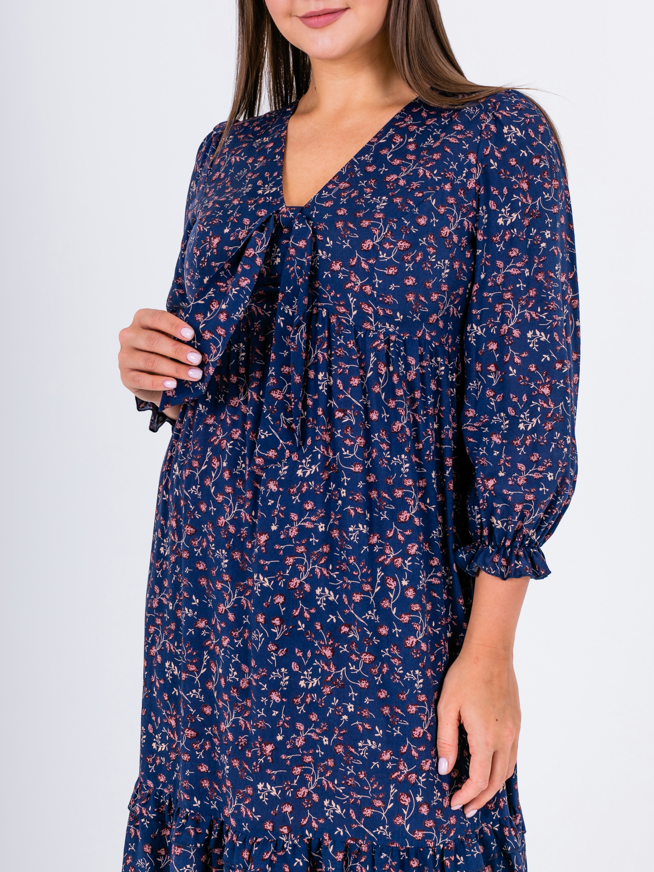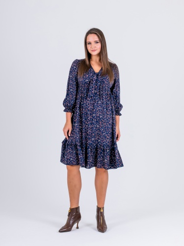 На сайте указаны российские размеры. Крой: платье свободного силуэта из гладкой вискозы в стиле бохо. Отрезное под грудью, расклешенное, имеет втачной рукав, низ которого собран на эластичную тесьму, что позволяет фиксировать его на комфортную высоту и разный объем рук. Платье состоит из двух ярусов, которые выгодное подчеркивают достоинства фигуры и изысканно маскируют недостатки. Платье подойдет женщинам разных фигур и комплекций, а в особенности будущим мамам и прекрасным обладательницам шикарных форм. Отделка: имеет тонкие завязки в области груди, которые можно повязать в узел или изысканный бант. Ткань в мелкий цветок создает женственный и романтичный образ, который влюбляет в себя с первого взгляда. Сочетайте с однотонными жакетами и кардиганами из ассортимента Stern.