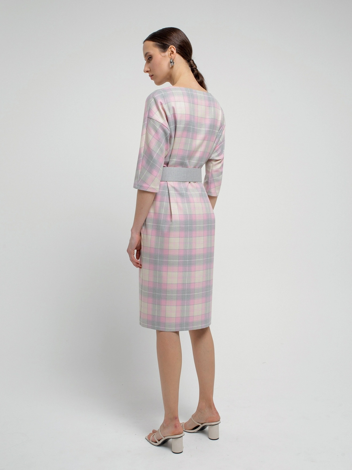 На сайте указаны российские размеры. Платье из костюмной ткани в серо-розовую клетку, полуприлегающего силуэта без застежки с горловиной лодочка и укороченным цельнокроеным рукавом. Обтяжной пояс фиксирует талию и добавляет мягкие складки. Есть потайные карманы в швах.. Рост модели 175 см.