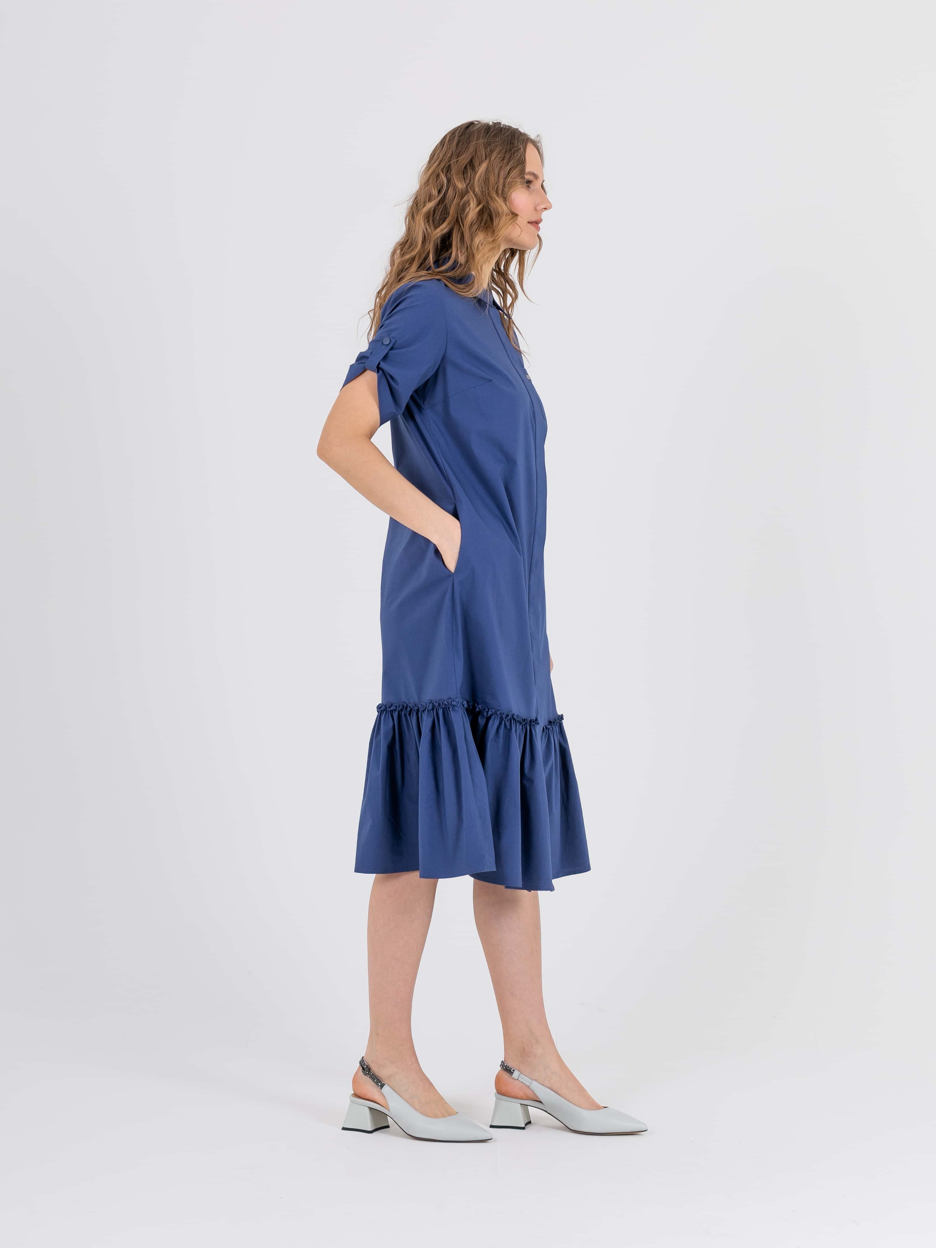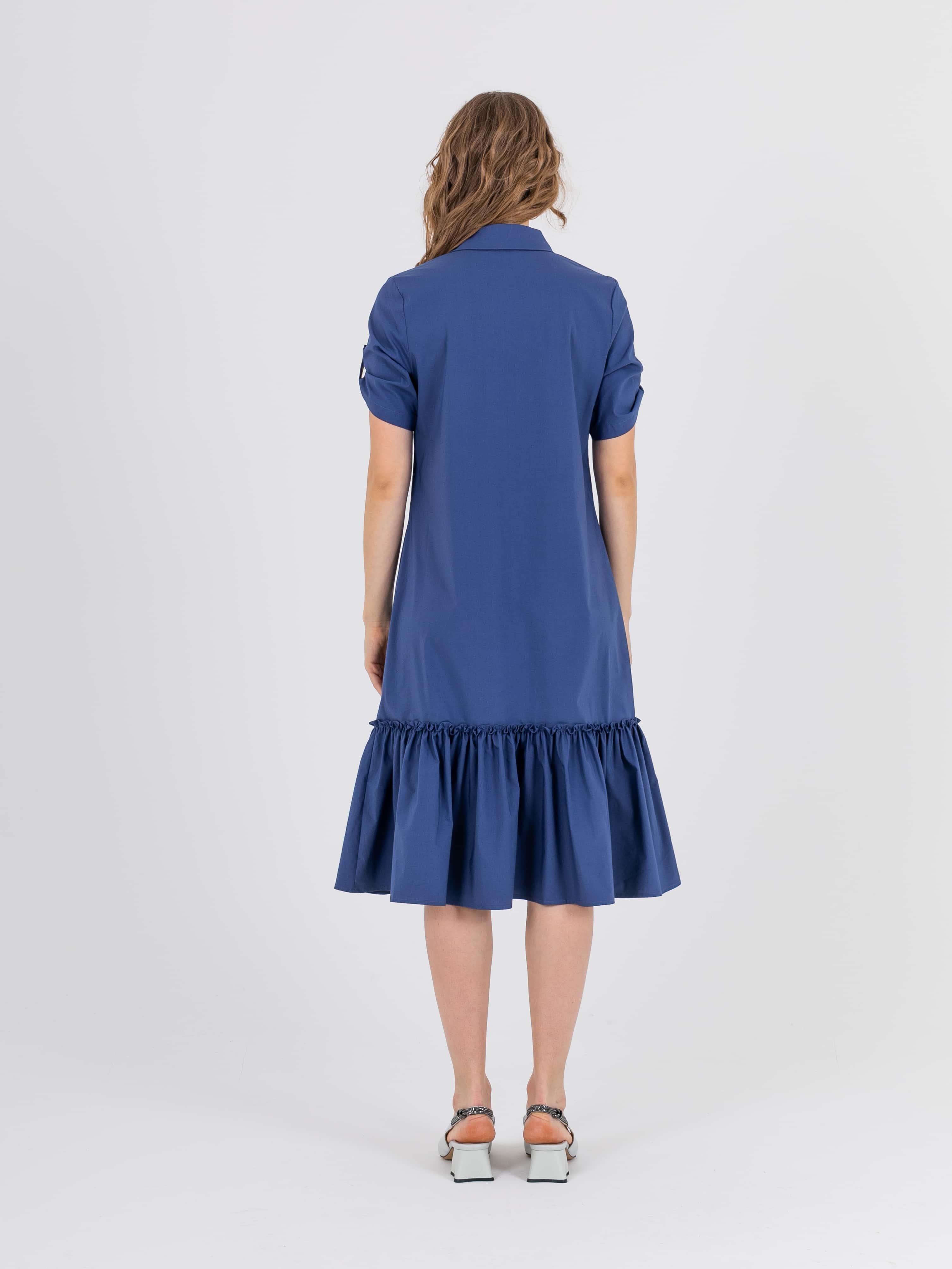 На сайте указаны российские размеры. Платье-рубашка А-силуэта длиной midi с оборкой по низу. Перед с двумя вытачками на выпуклость груди, идущими из боковых швов. Застежка потайная на 10 пуговиц. Также в области груди располагается накладной карман с декоративной аппликацией из страз. Укороченные рукава с патами на пуговицах. Стояче-отложной воротник.