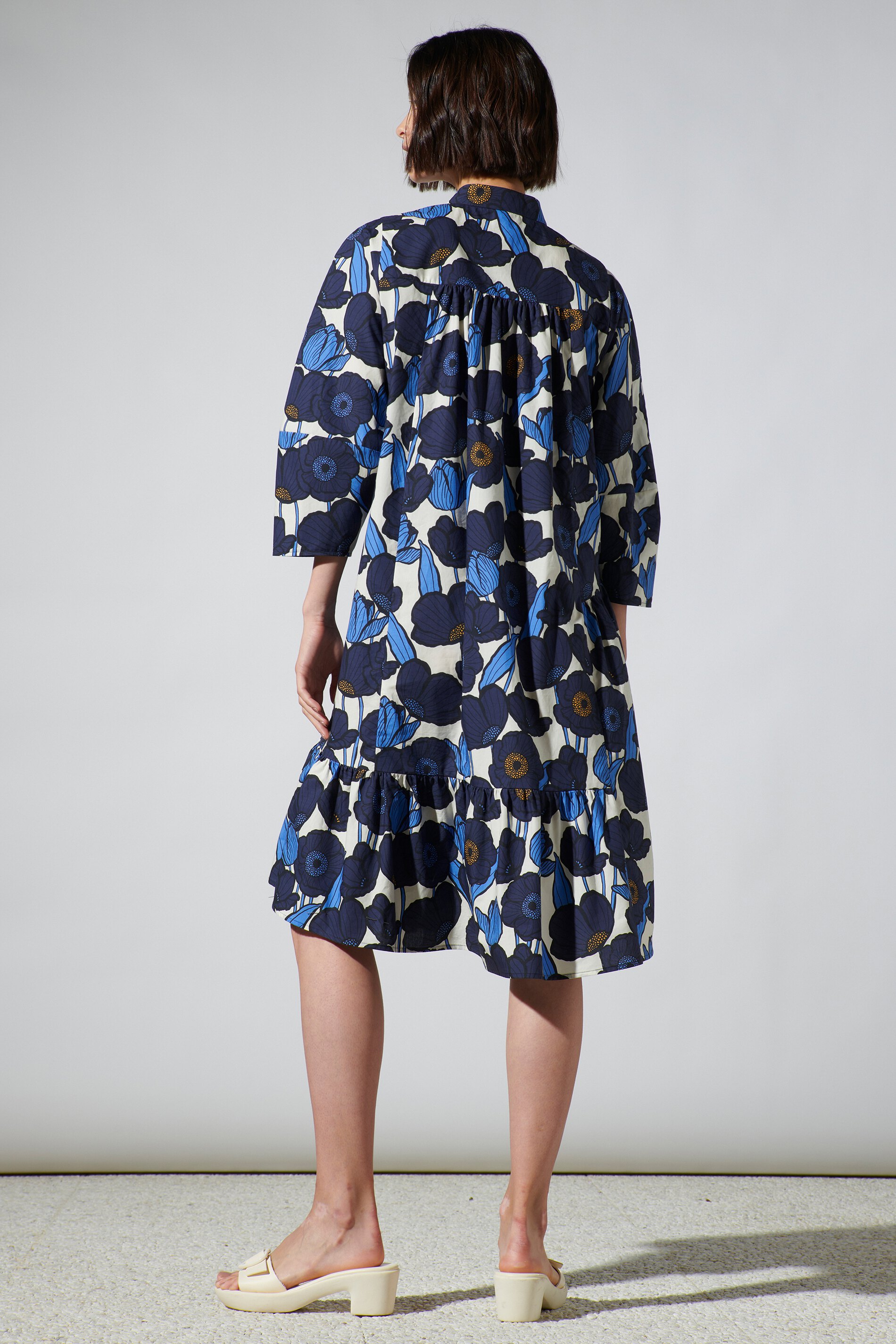 На сайте указаны российские размеры. Женственное платье-рубашка с эксклюзивным абстрактным принтом в виде маков на хлопковом поплине, асимметричного кроя, с рукавами средней длины и поясом средней длины с потайной пуговицей. Талию можно подчеркнуть двумя поясными завязками. Рост модели 178 см