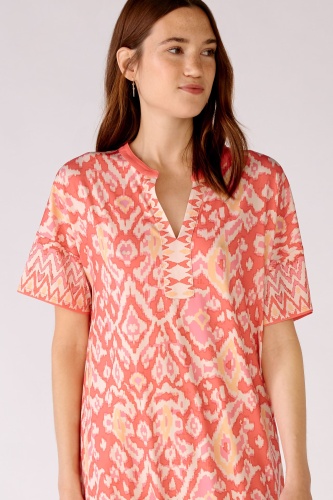 На сайте указаны российские размеры. Красочной платье OUI без складок из немнущаяся ткани Silky Touch с принтом по всей поверхности. Прямой крой, длина до колена. Красивый вырез на тунике. Укороченный рукав до половины. Длина в размере 42: 94 см. Рост модели 177 см.