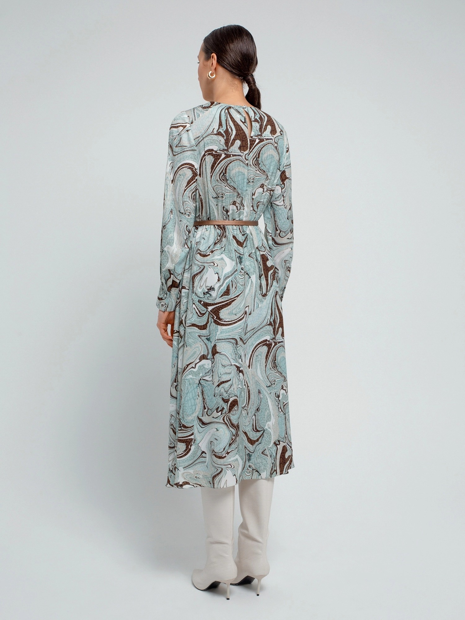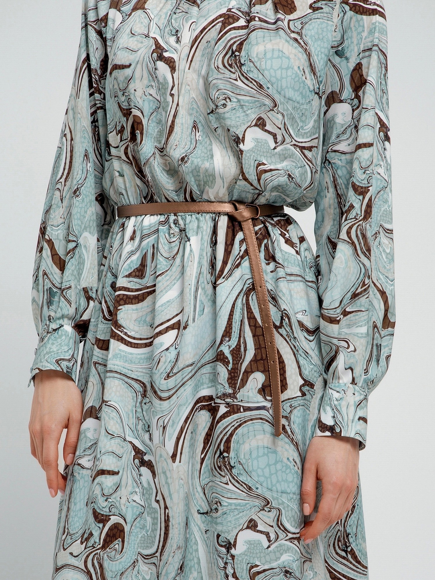 На сайте указаны российские размеры. Романтичное платье приталенного силуэта с втачным длинным рукавом на манжете. Выполнено из премиальной плательной ткани с модным абстрактным принтом. У платья круглая горловина, оформленная складками. В комплекте к платью идет тонкий пояс из экокожи. Длина изделия: 111 см. Рост модели 175 см.