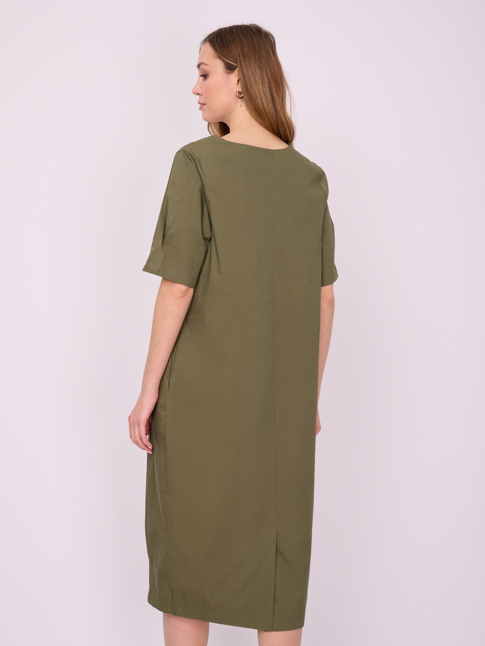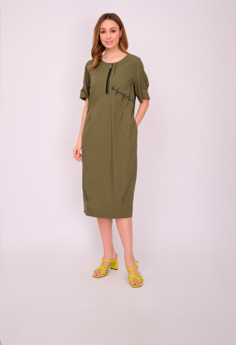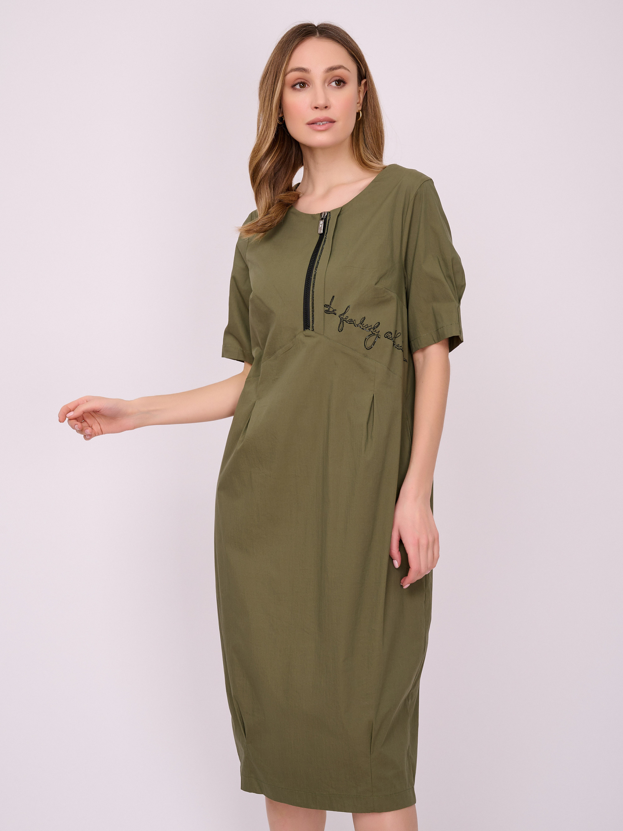 На сайте указаны российские размеры. Платье средней длины на молнии с округлой горловиной, короткими рукавами, кокеткой и юбкой «тюльпан». Украшено надписью со стразами. Длина по спинке: 110 см. Рост модели 175 см.
