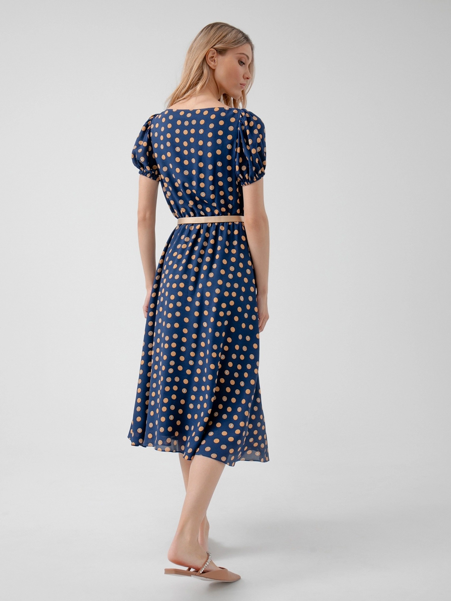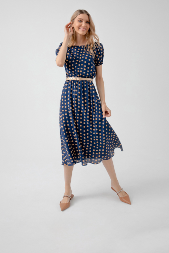 Приталенное платье из вискозной ткани с принтом с юбкой полусолнце. Платье с небольшим втачным рукавом на резинке и круглой горловиной. В комплект входит тонкий пояс из экокожи цвета охры.