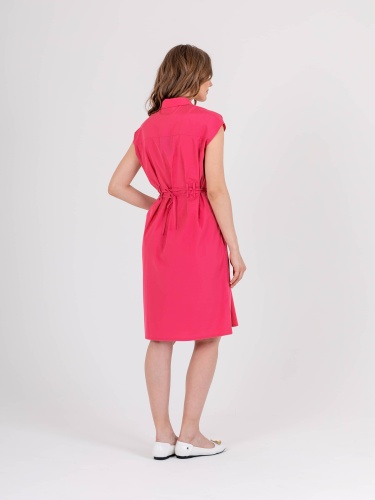 Яркое платье полуприлегающего силуэта длиной выше колен из легкого 100% хлопка со съемным поясом и карманами в боковых швах. На спинке прямая кокетка и двойные шлевки для более плотного прилегания. Короткие цельнокроеные рукава. Стояче-отложной воротник с декоративной планкой на 6 прорезных петель и пуговиц.