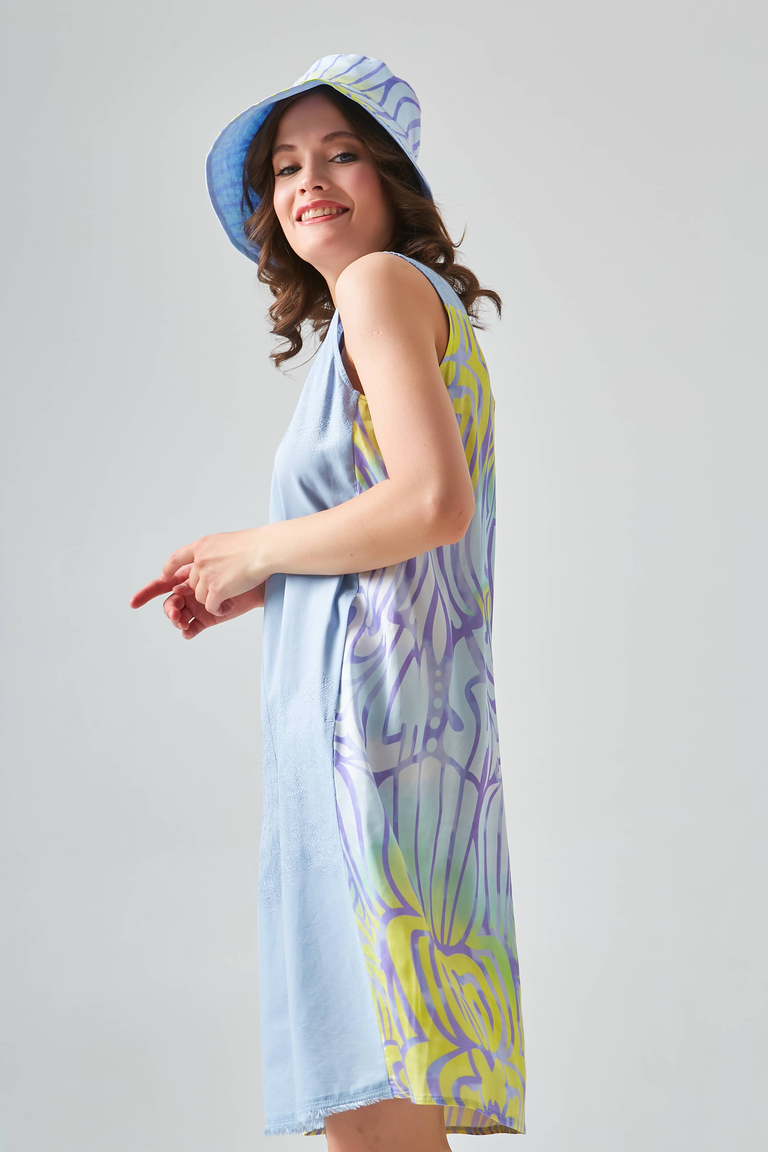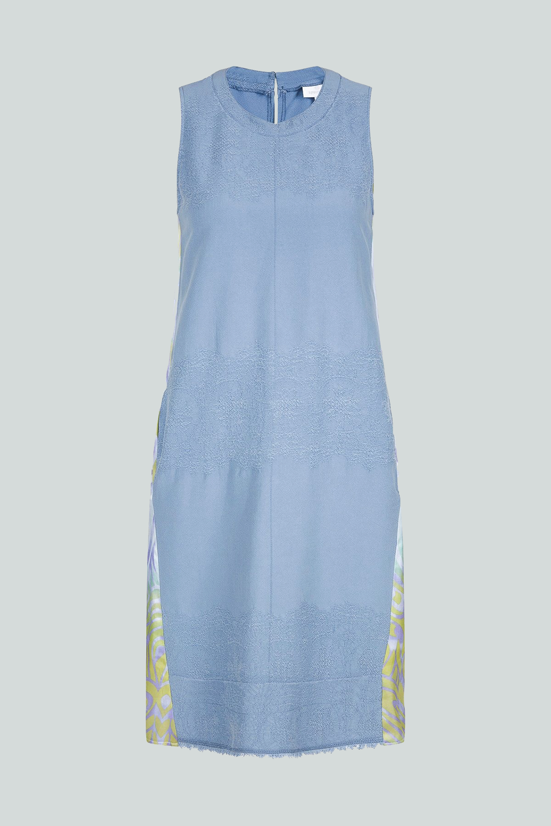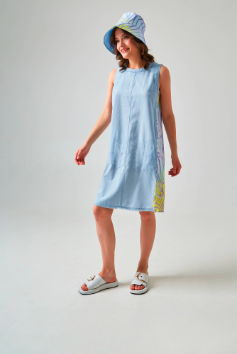 Платье без рукавов в сочетании высококачественной ткани Tencel спереди и набивной струящейся атласной ткани сзади позволяет платью комфортно сидеть на теле. Круглый вырез горловины украшен бахромой. Разрез и застежка на пуговице посередине спины.