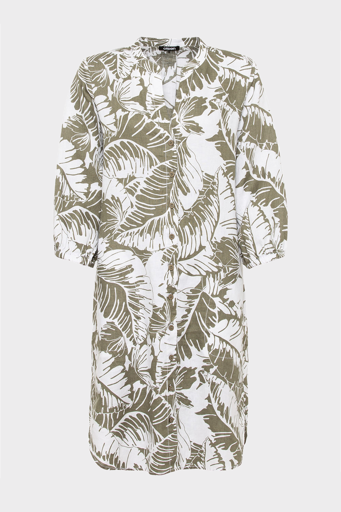 Платье с тропическим садовым принтом. Застежка на пуговицах позволяет носить его закрытым как платье или расстегнутым как удлиненный плащ или пляжную накидку. Закругленная кромка и потайные боковые карманы изготовлены из 100 % льна, обеспечивающего воздухопроницаемость и комфорт.