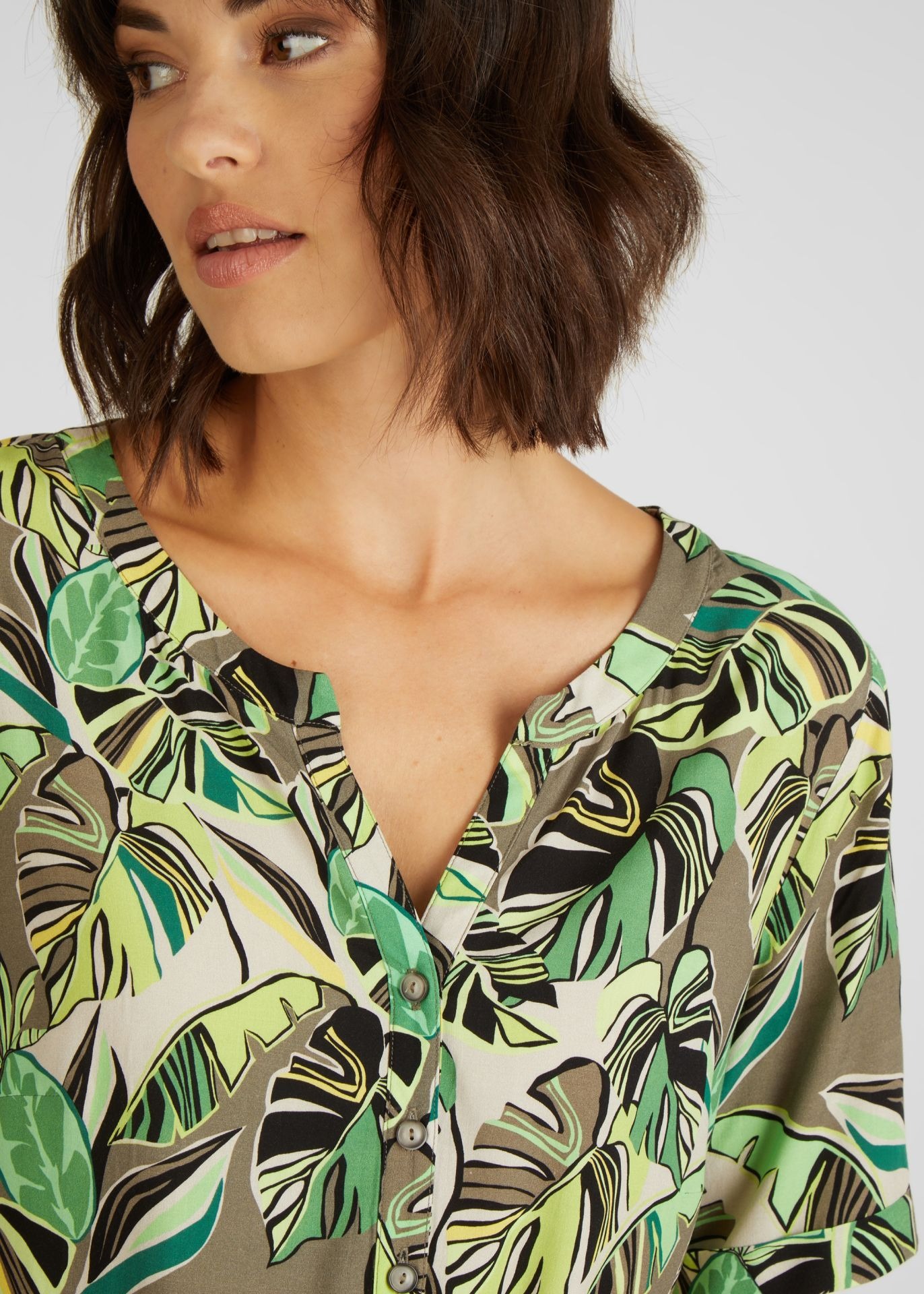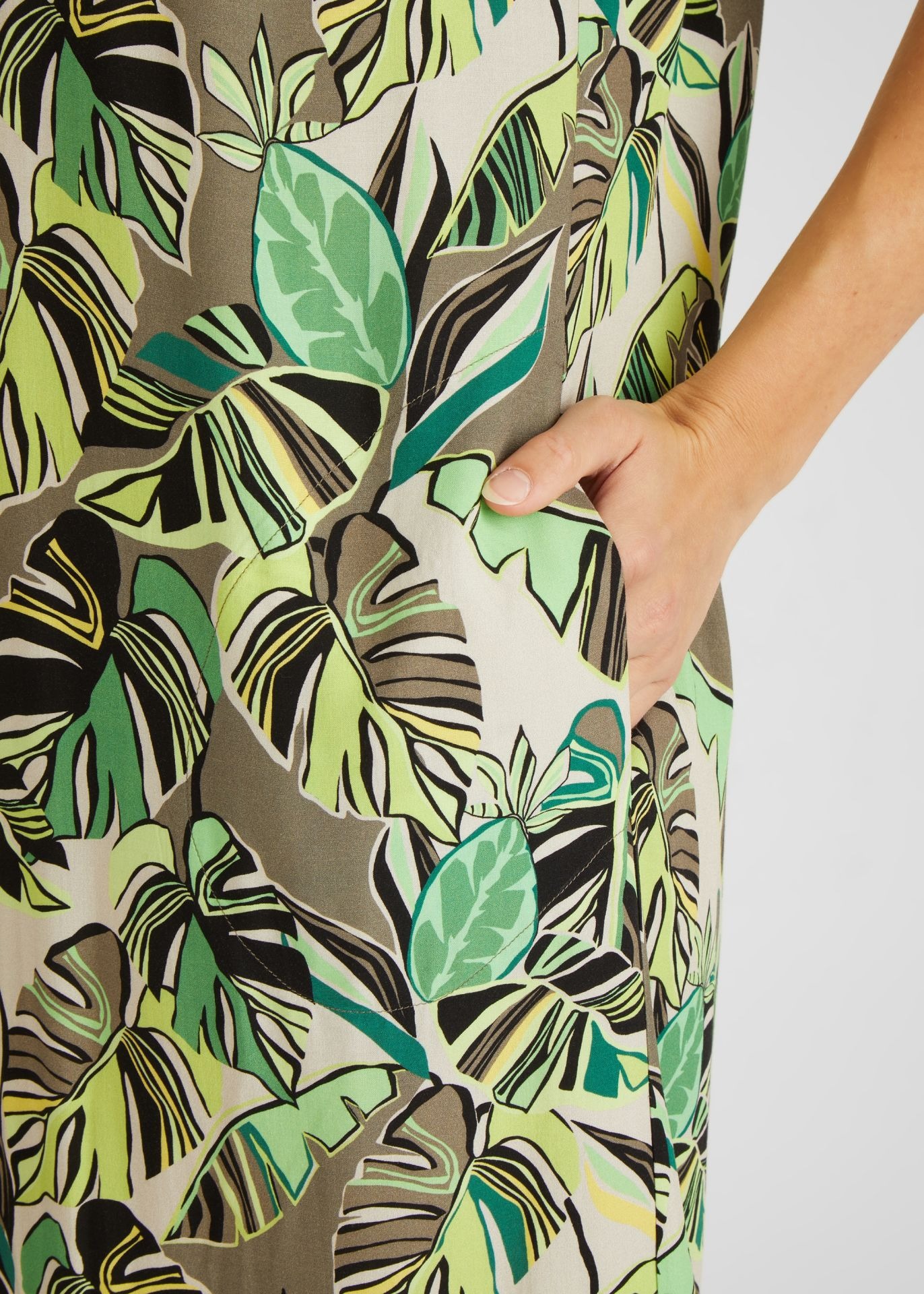 Платье-рубашка с узором из пальмовых листьев — это модный и удобный предмет гардероба для женщин. Классический круглый вырез горловины с небольшим V-образным вырезом, слегка подчеркивающим декольте. Рисунок платья вдохновлен тропическими пальмовыми листьями, напечатанными на легкой и дышащей вискозной ткани. Это платье идеально подходит для самых разных случаев, от повседневных дел в офисе до расслабленных мероприятий на выходных. Сочетайте его с босоножками и сумкой, чтобы создать простой и легкий образ. Независимо от того, как вы его носите, это платье-рубашка станет удобным и стильным вариантом.