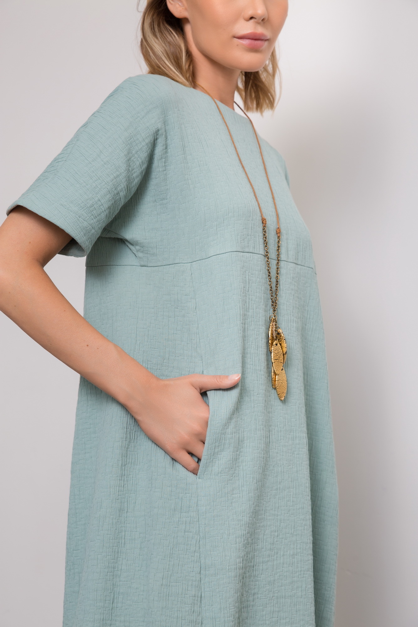 На сайте указаны российские размеры. Лаконичное и комфортное платье свободного О-образного силуэта. Выполнено из смесового хлопка с неординарной «мятой» фактурой. По низу регулируется кулиской. В рельефах бочков удобные карманы. На спинке застежка – свободно завязывающийся шнурок.