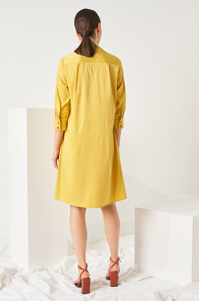 Платье-рубашка свободного силуэта с V-образным вырезом горловины с отложным воротником и лацканами. Центральная застежка на контрастные пуговицы. Рукава ¾, сосборены на манжету с разрезом и застежкой на контрастные пуговицы. Спереди нагрудные накладные карманы с клапанами. В боковых швах выполнены потайные карманы. Спинка с кокеткой. Дополняется контрастным поясом-лентой с прямоугольными пряжками.