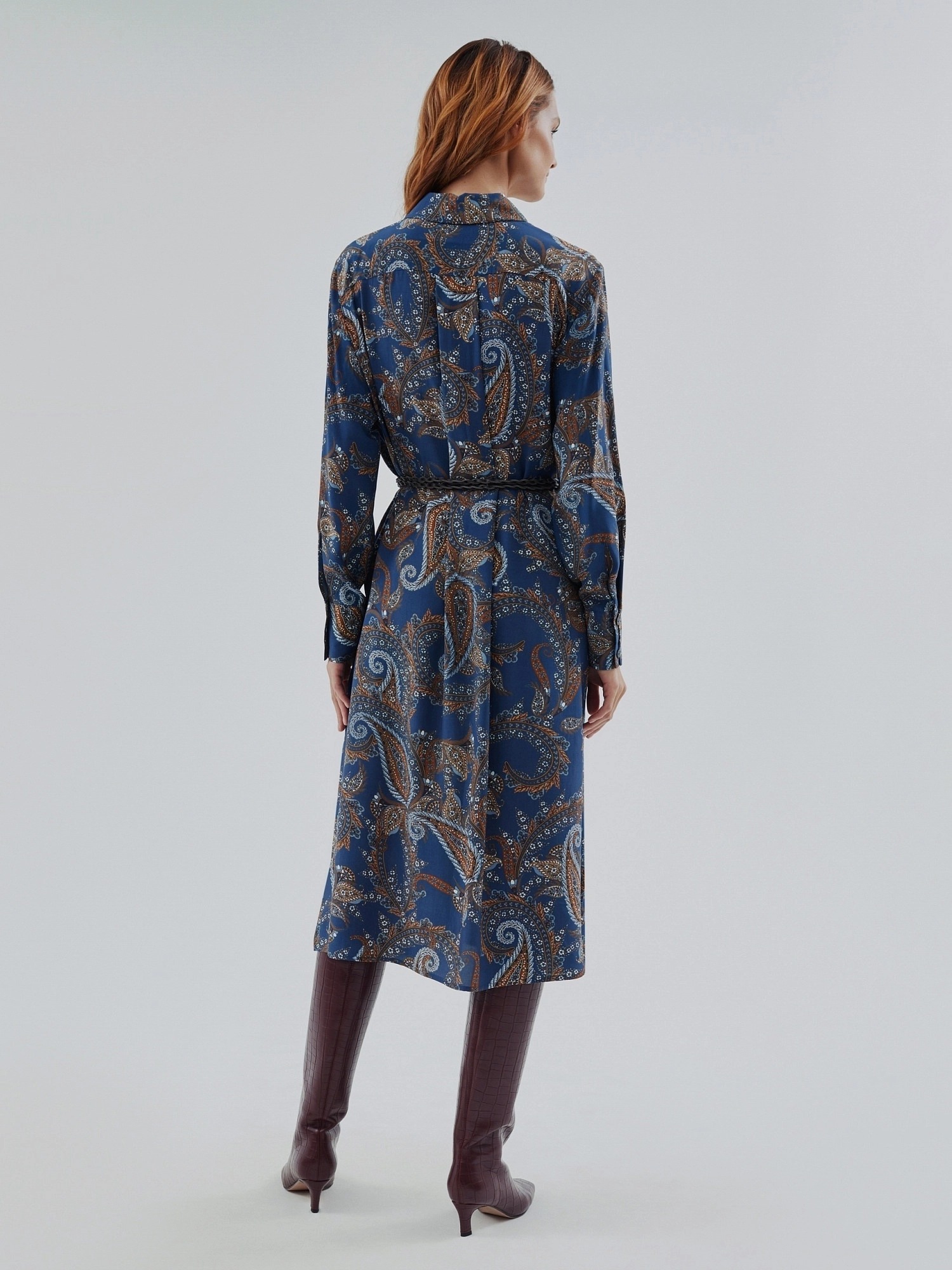Платье-рубашка из 100% вискозы прямого, свободного силуэта длины миди с классическим отложным воротником и втачным рукавом полной длины на манжете. Застежка спереди потайная на пуговицы, по боковым швам разрезы. В комплект входит крученый тонкий пояс из экокожи для создания более приталенного силуэта.