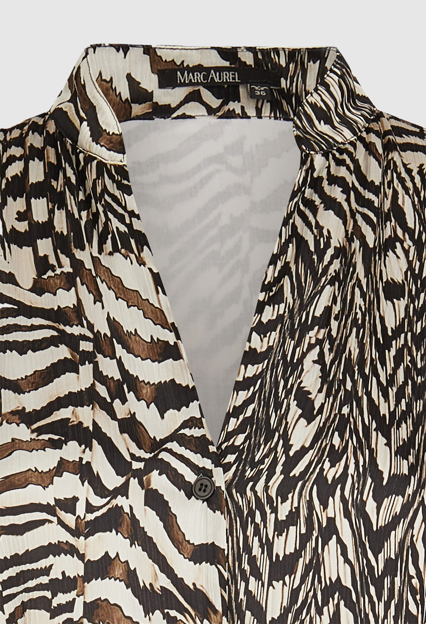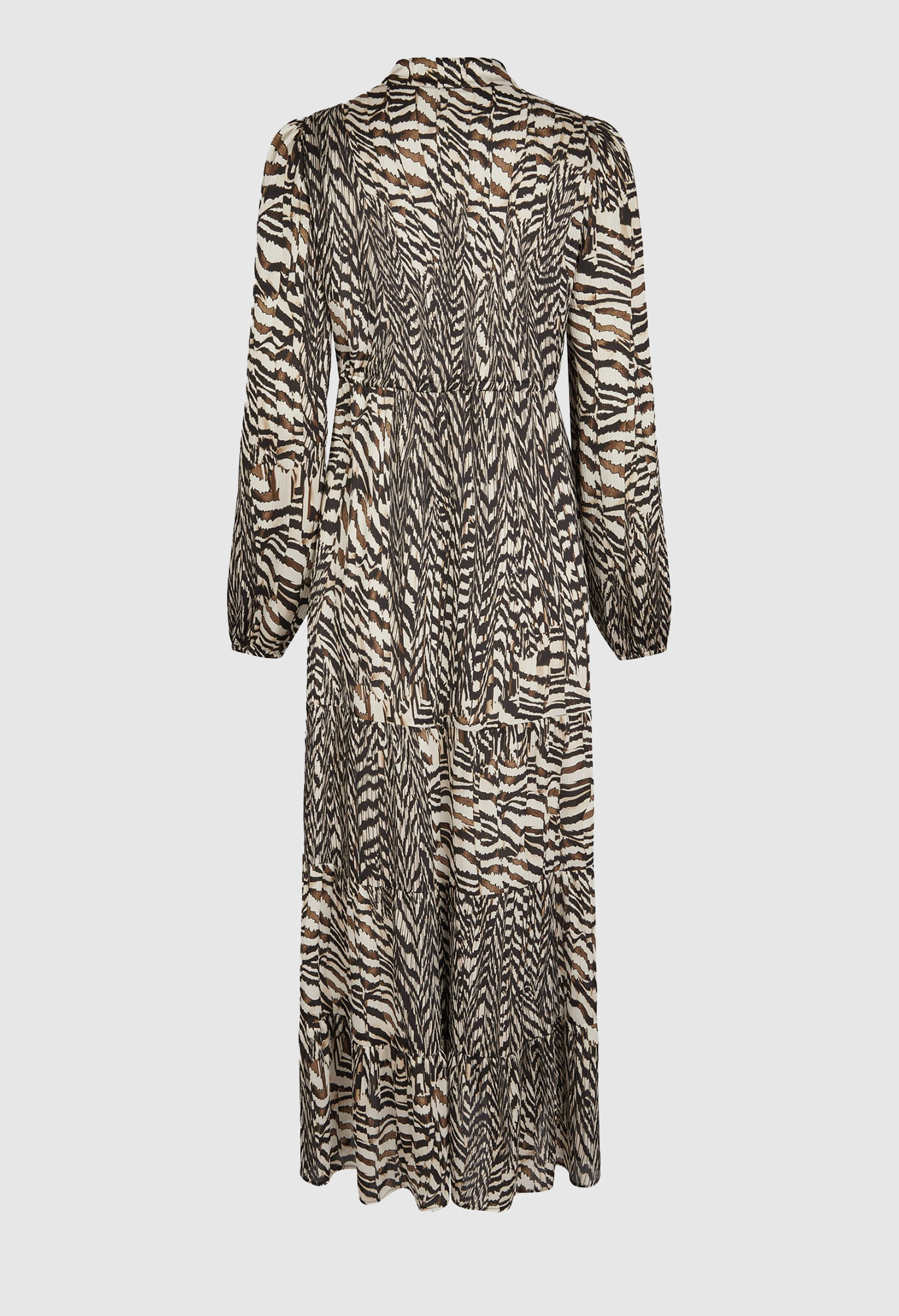 Платье-макси с модным графическим животным принтом из мягкой мятой ткани впечатляет оптической многоярусной юбкой с оборками для увеличения ширины и V-образным вырезом с воротником-стойкой. Эластичная талия с кулиской создает свободный акцент, создавая струящийся образ.