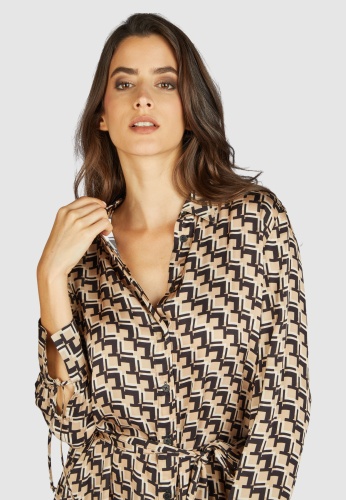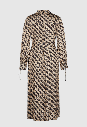 Платье-макси из вискозного атласа впечатляет четкой структурой, рубашечным воротником и заметной планкой на пуговицах. Манжеты с завязками и пояс из внешней ткани расставляют акценты. Модный геометрический принт делает это платье настоящей изюминкой.