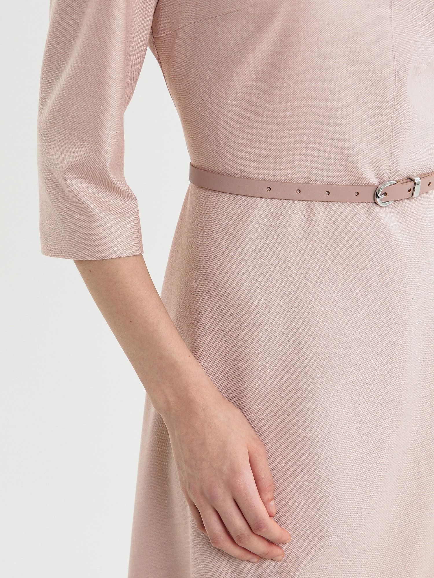 Полуприлегающее платье с отрезной линией по талии и юбкой полусолнце, вырез горловины круглый, по центру шов. Рукав втачной. На спинке потайная молния. В комплект входит тонкий ремень из экокожи пыльно-розового цвета.