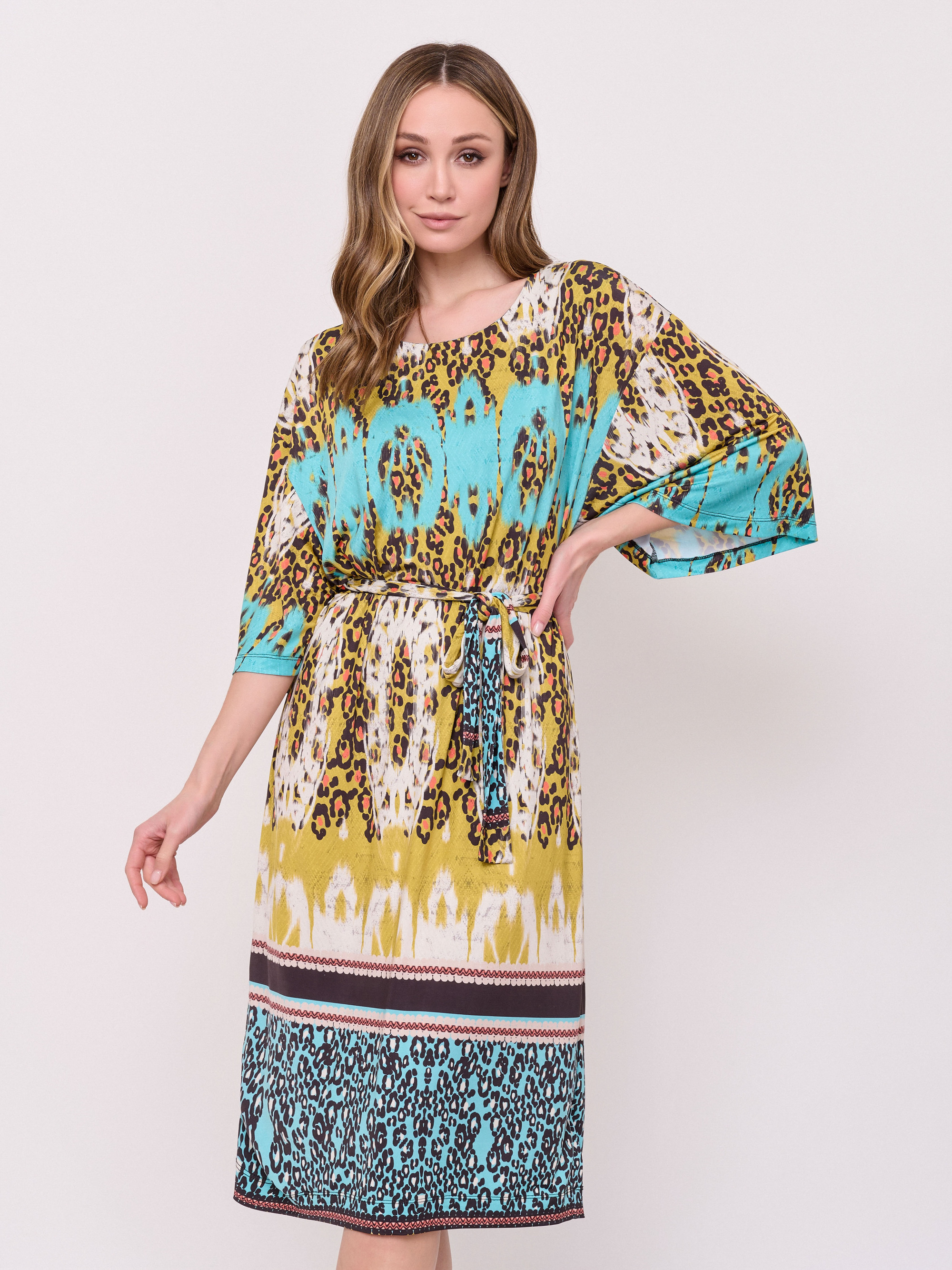 Детали: без застежки, вырез горловины округлый, рукава 3/4, покрой прямой, рисунок орнамент, без карманов, конструктивные элементы пояс, длина платья миди, нижний слой. Длина по спинке: 115 см.