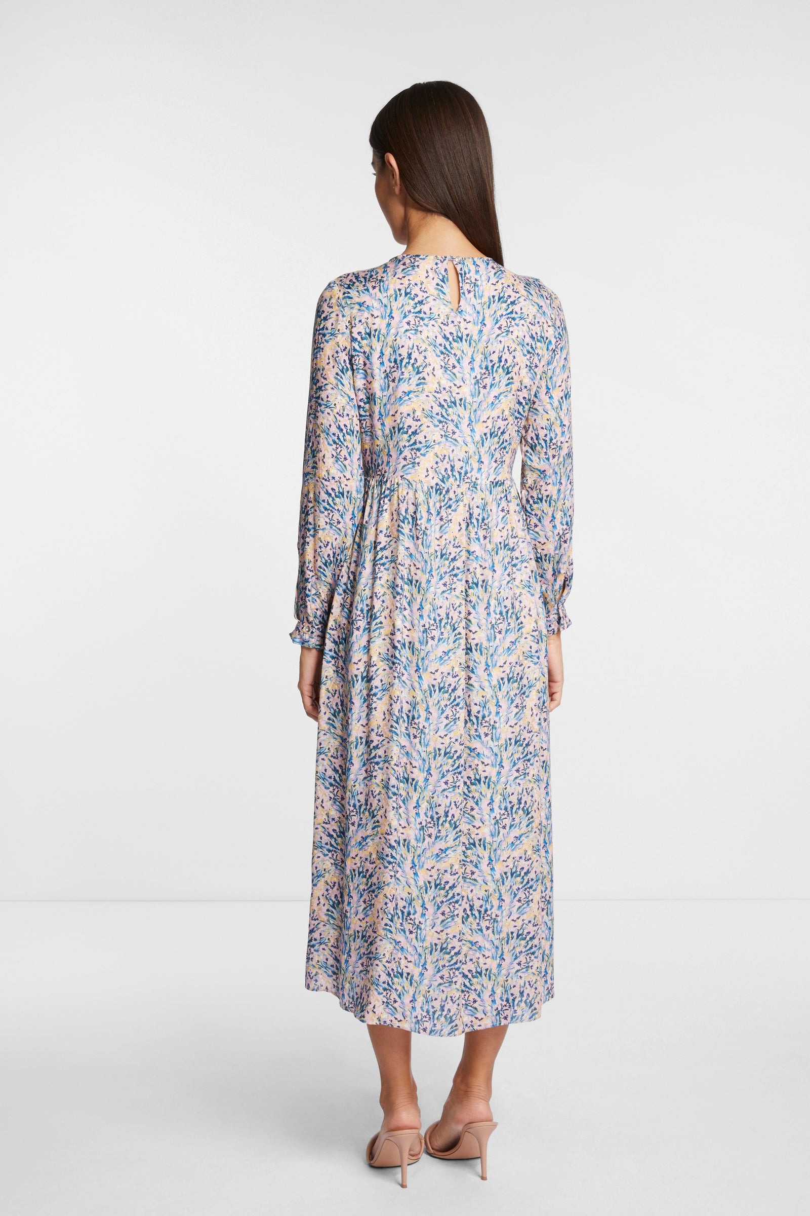 Платье удивительно женственное с романтическим цветочным узором. Верх свободного кроя, юбка длины миди имеет широкую, ниспадающую форму. Оборки на манжетах рукавов и изящная пуговица на шее подчеркивают игривый образ.