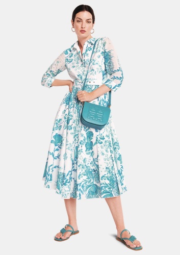 Платье из хлопкового батиста с эксклюзивным подводным принтом, блузкой-рубашкой, развевающейся юбкой и поясом выглядит современно.