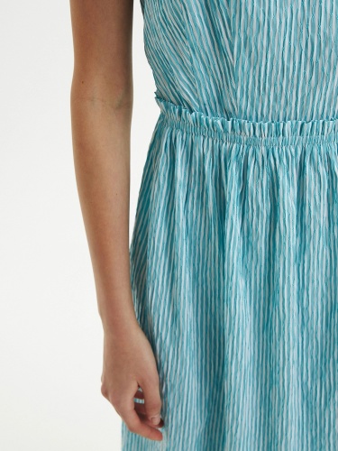Романтичное приталенное платье без рукавов, из фактурной плательной ткани с бирюзовой полоской. С расширенной юбкой на резинке и рюшем на талии.