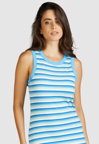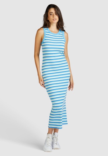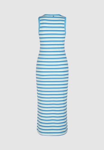 Платье-майка с модным узором в полоску изготовлено из мягкого вискозного трикотажа, обеспечивающего комфортную посадку. Оно выделяется круглым вырезом и узким кроем. Практичная длина миди создает эффектный силуэт.