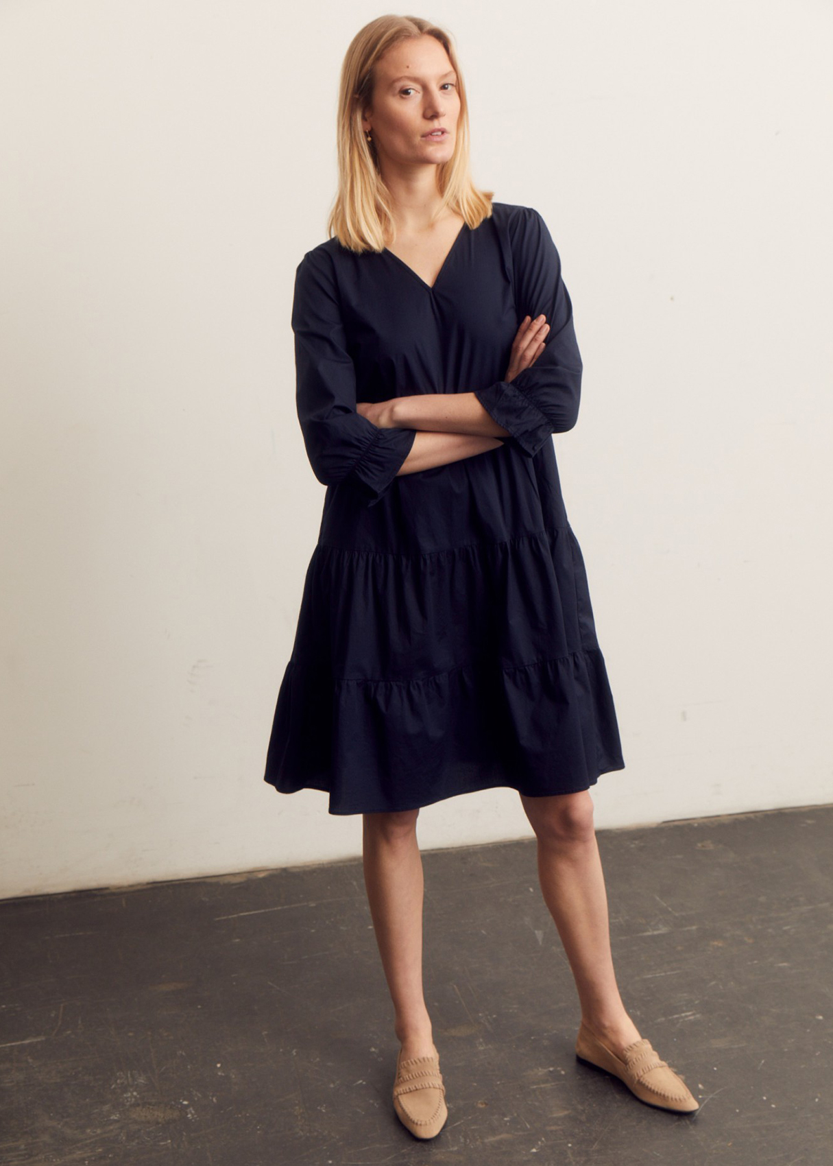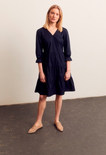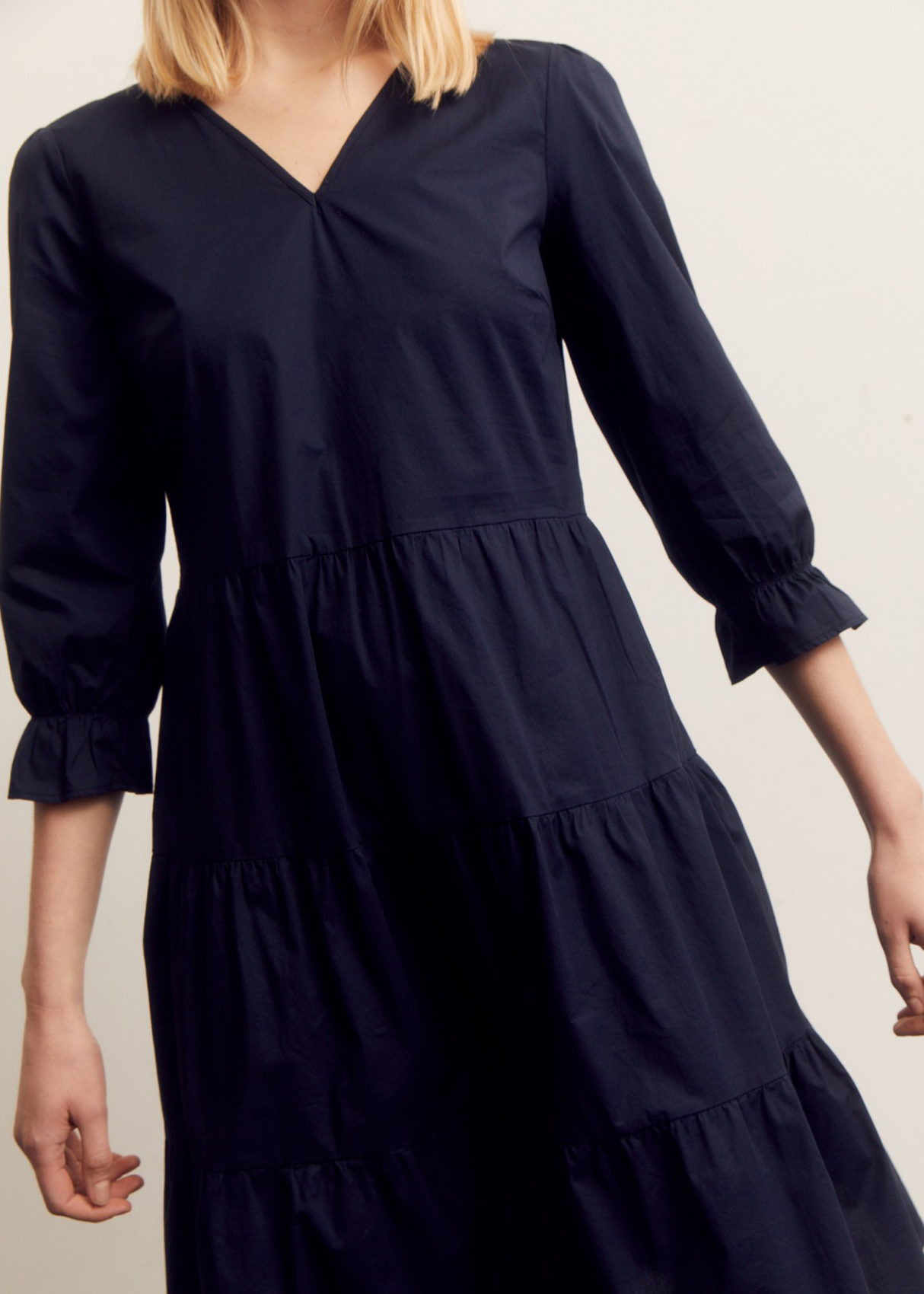 Однотонное платье свободного кроя с рельефами подойдет как для делового, так и для повседневного образа. Носите его с кроссовками, сандалиями или каблуком в зависимости от случая. V-образный вырез горловины. Втачной рукав ¾ с оборками.