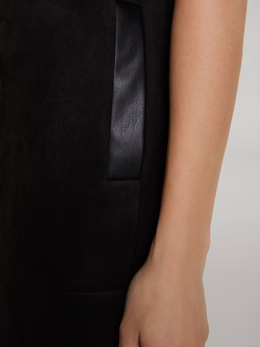 Черное мини-платье прямого кроя выполнено под замшу. Круглый вырез горловины, корткий втачной рукав. Врезные карманы с листочкой из экокожи являются стильным акцентом.