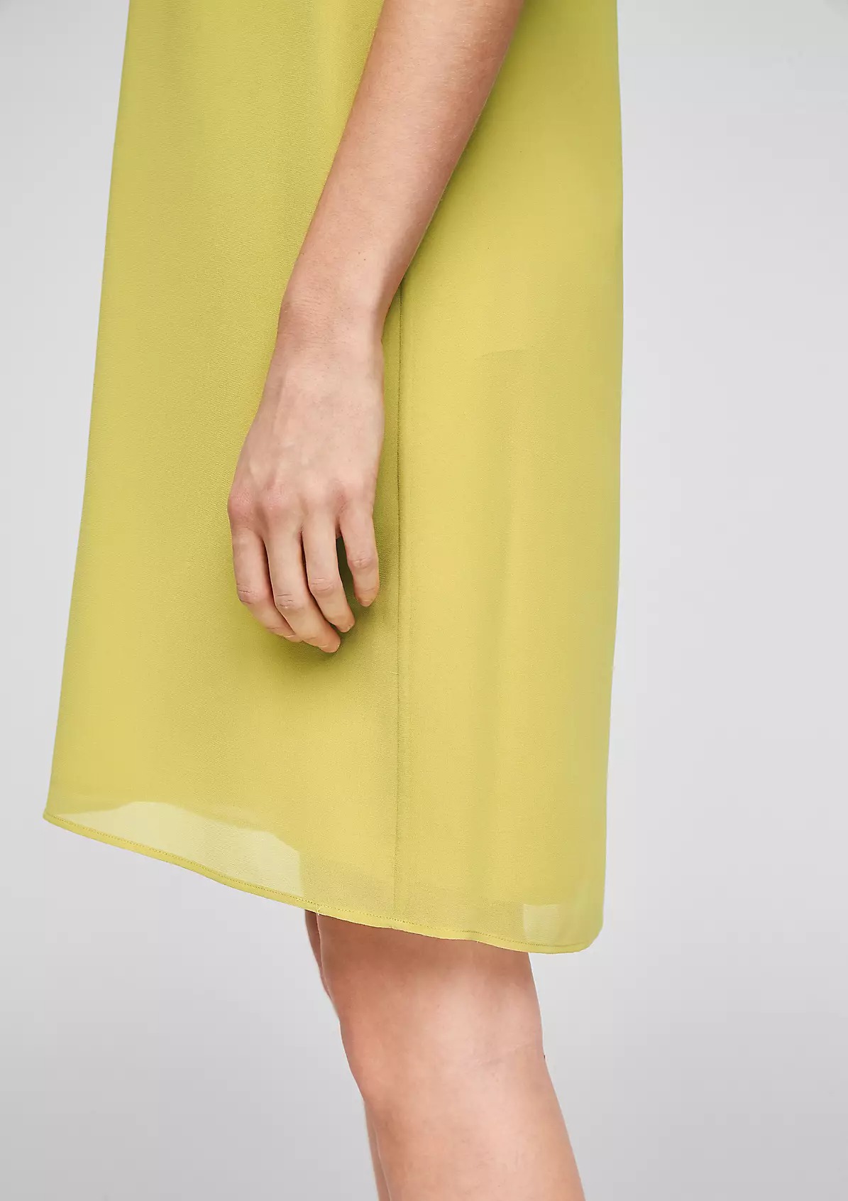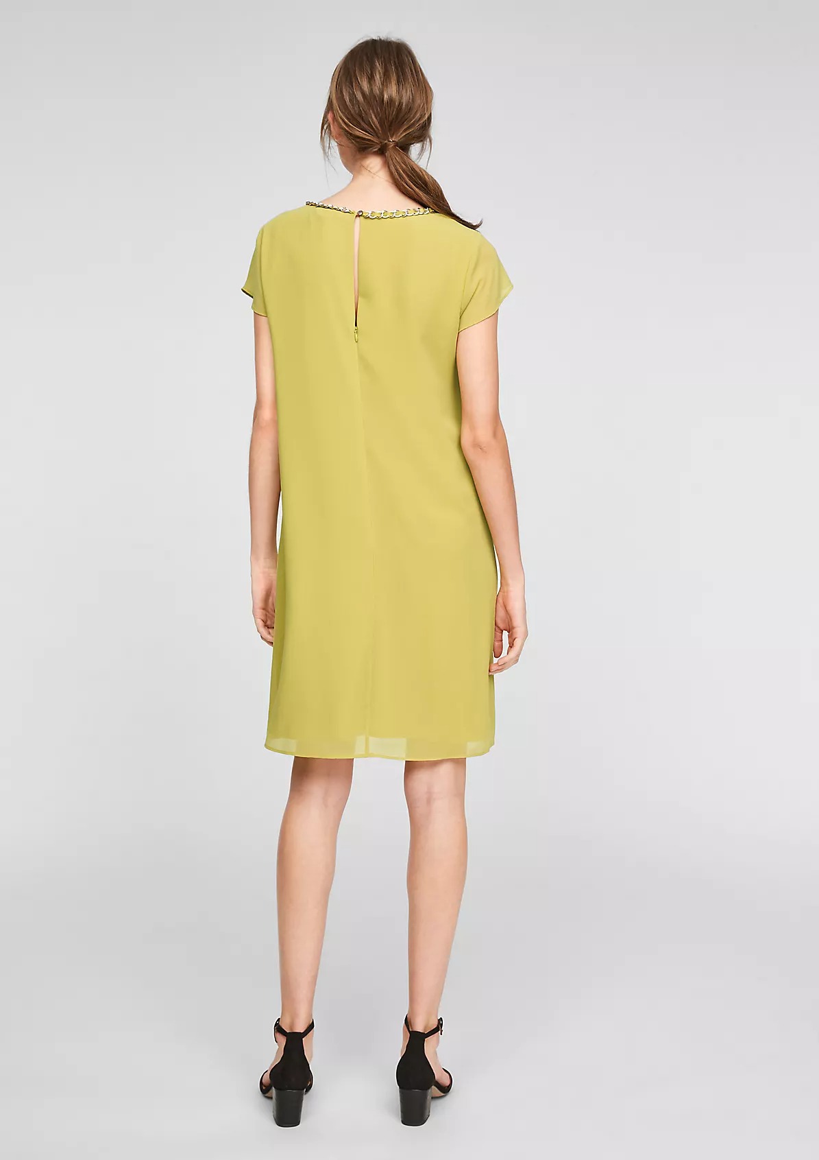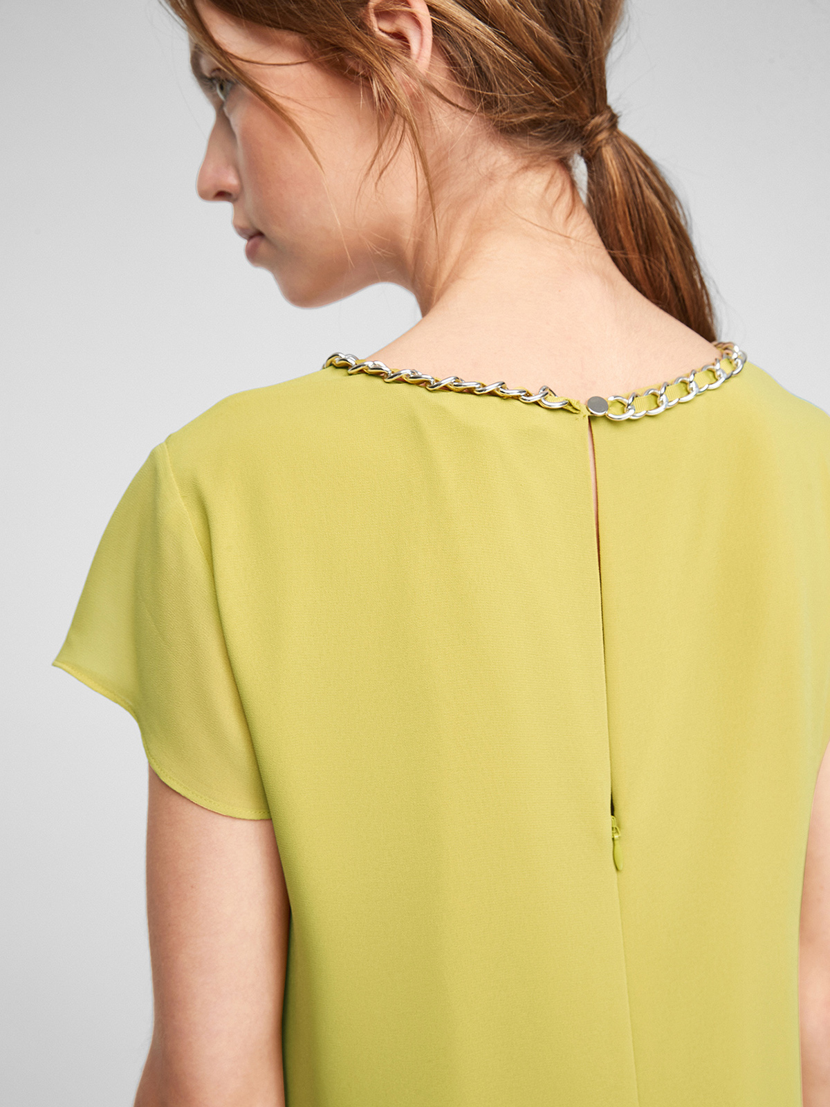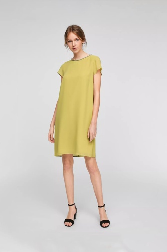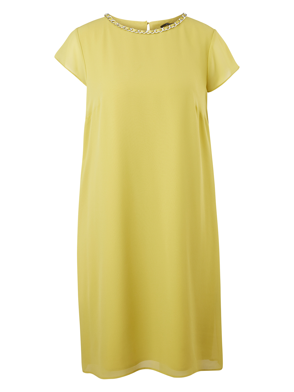 Однотонное платье прямого кроя с коротким цельнокроенным рукавом. Застежка на скрытую молнию сзади, овальный вырез горловины украшен цепочкой.