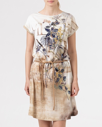Платье прямого кроя длины мнини с цветочным принтом. Цельнокроеный короткий рукав, овальный вырез горловины. В комплекте идет пояс-шнурок.