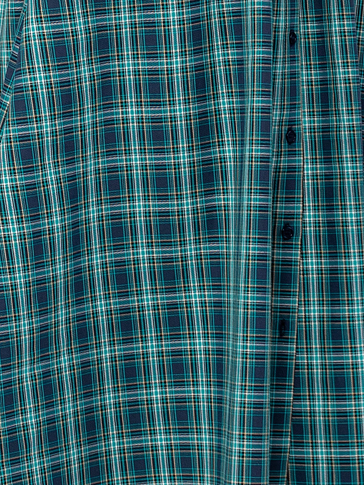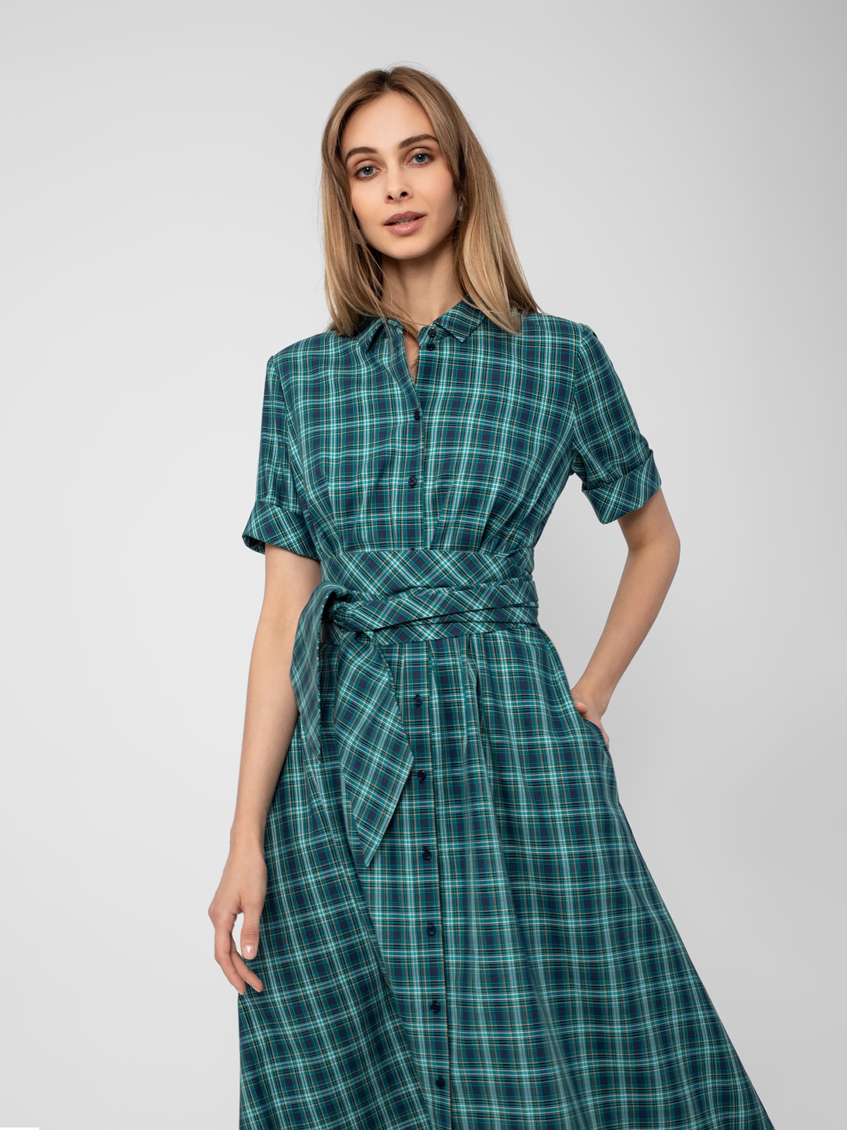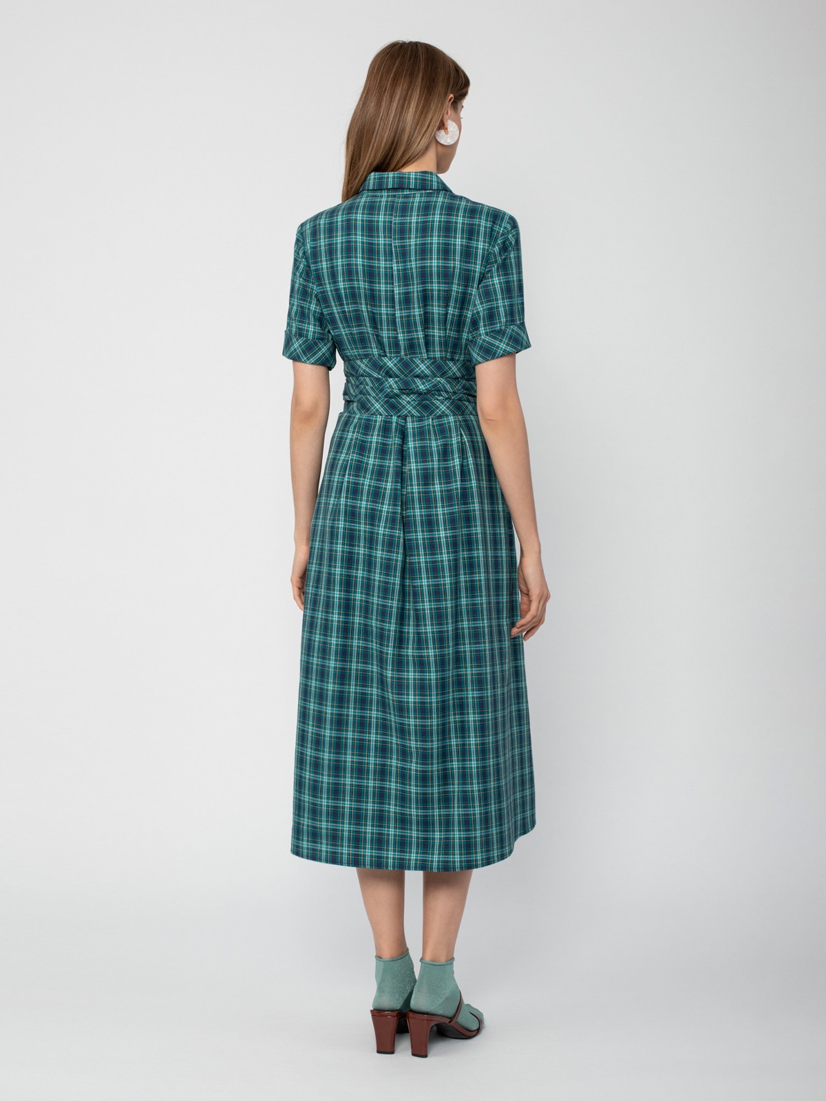Платье из костюмной ткани в клетку приталенного силуэта с широкой юбкой А-силуэта, классическим отложным воротником, коротким рукавом кимоно и застежкой спереди на пуговицы. На талии широкий завязывающийся съемный пояс из основной ткани.