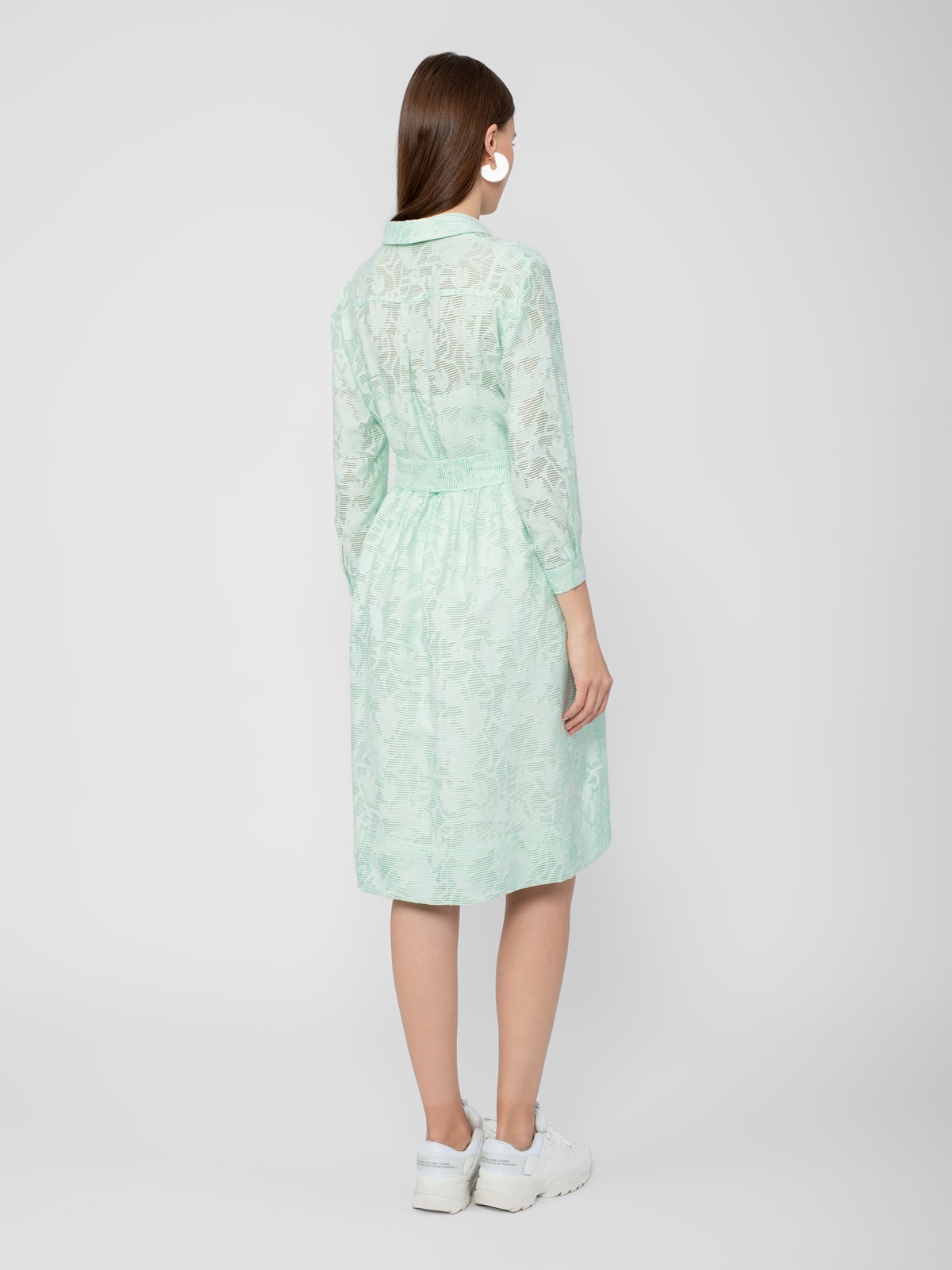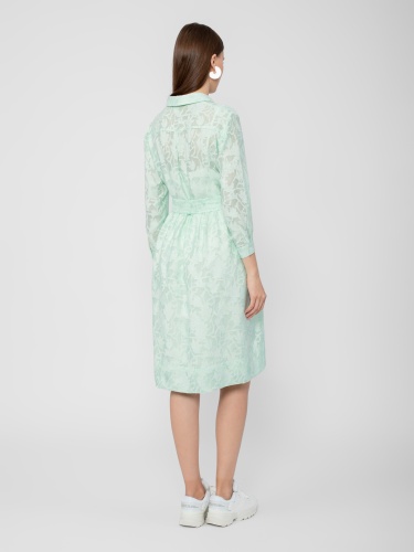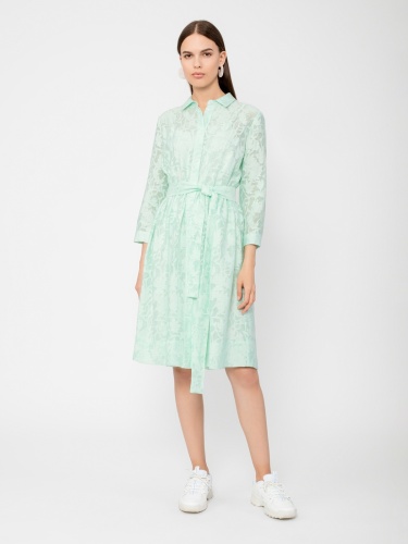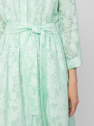 Платье-рубашка из плательной ткани с принтом. Силуэт трапеция, классический отложной воротник, втачной рукав на манжете, застежка спереди на пуговицы. На талии съемный пояс из основной ткани.