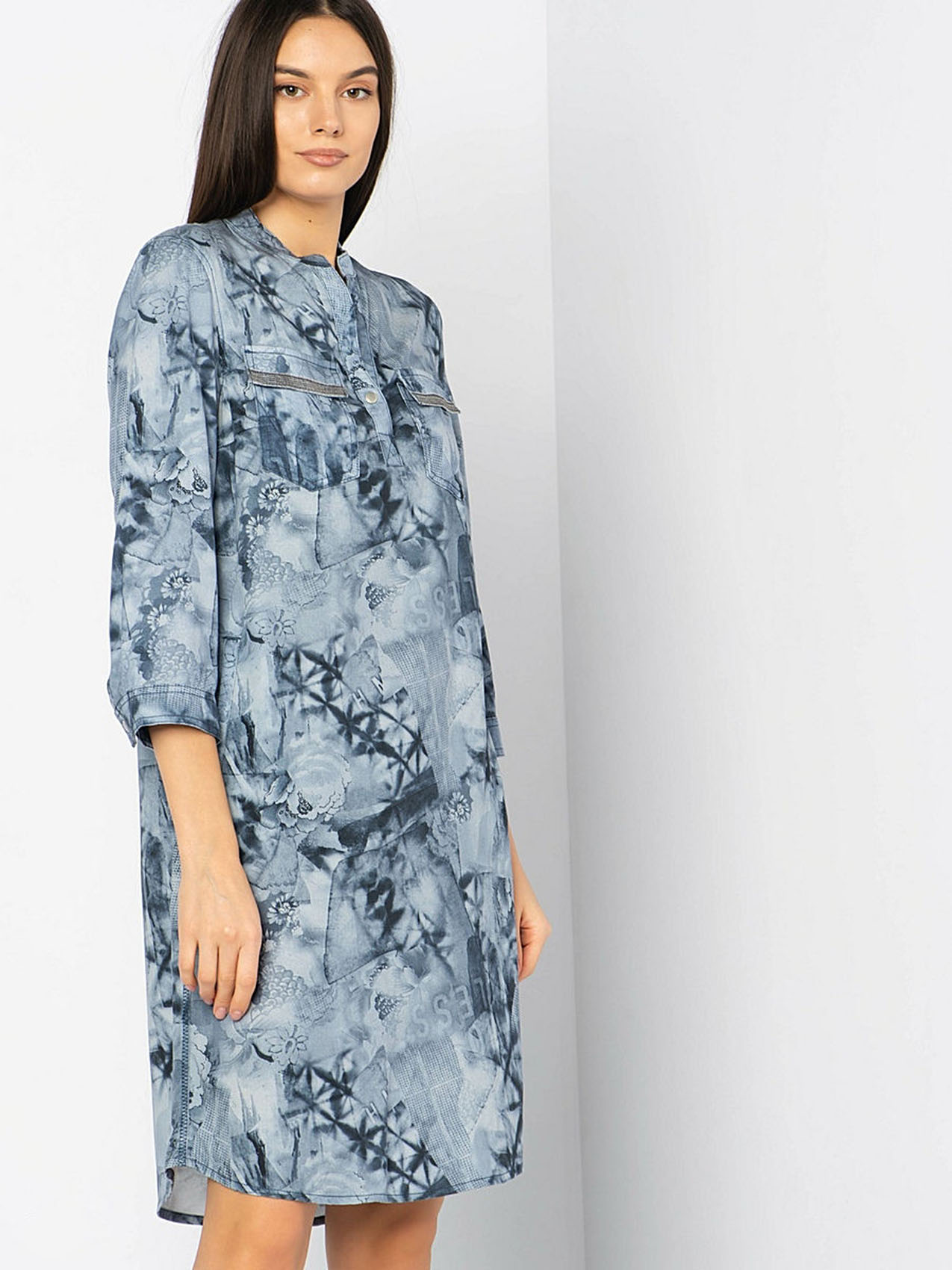 Платье из тенсела. Длина миди. V-образный вырез горловины, рукава 3/4, накладные карманы. Принт с изображением цветов и легким эффектом батика. Длина изделия по спинке: 70 см.