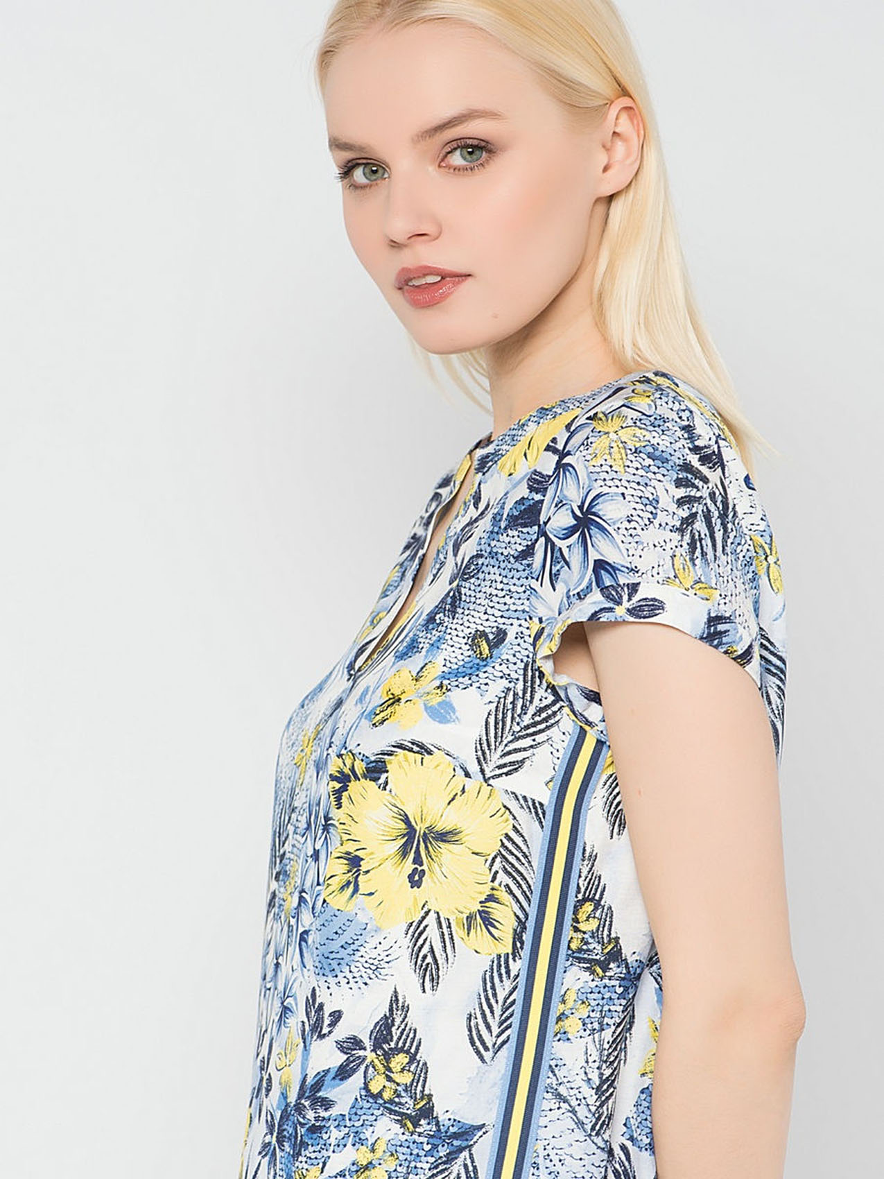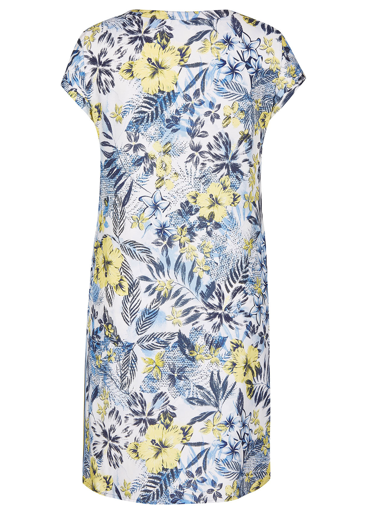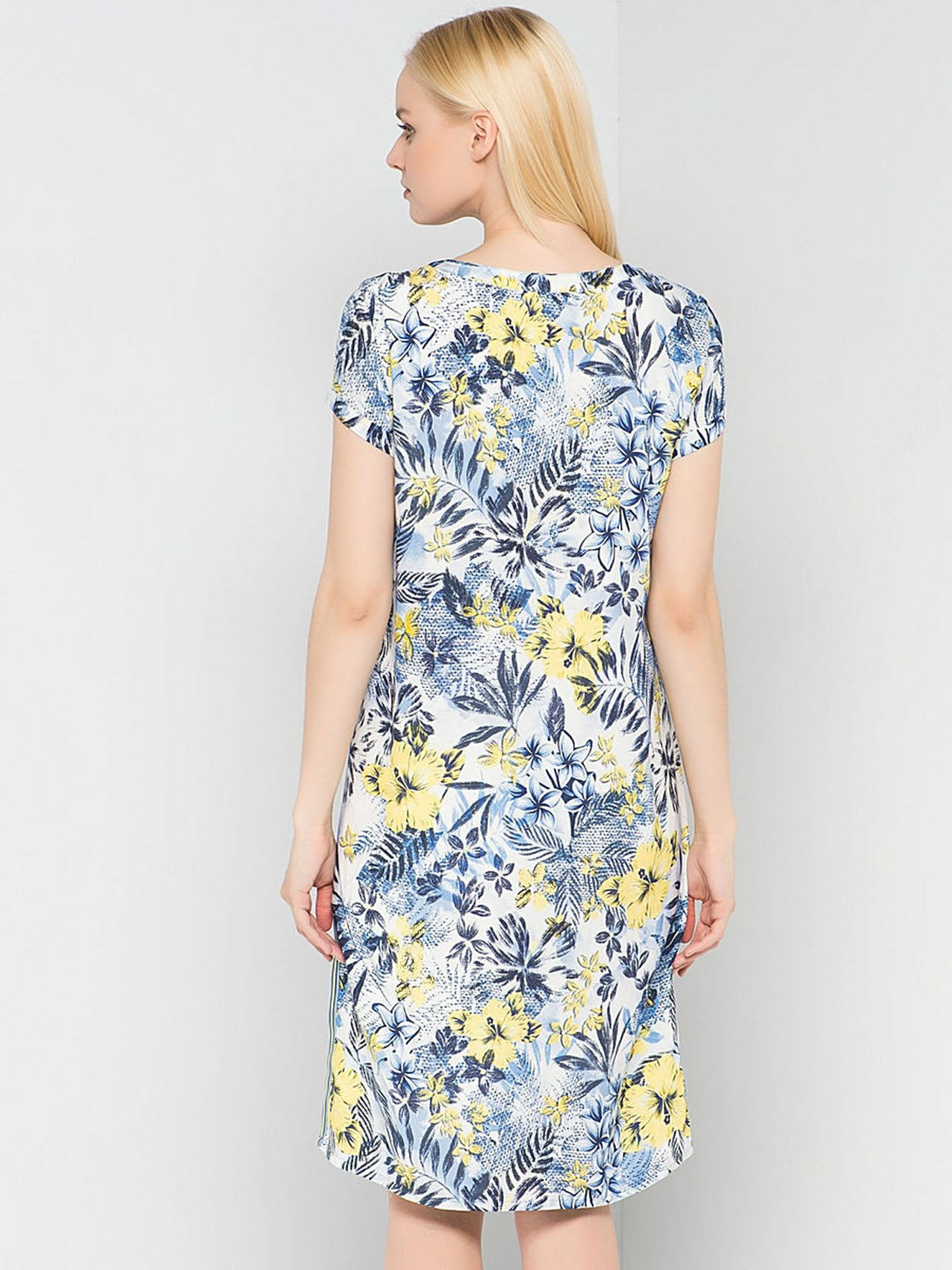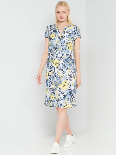 Платье с изображением тропических цветов - хит весенне-летнего сезона. Вискозный материал очень приятен к телу и обеспечивает максимальный комфорт. Слегка приталенный покрой подчеркивает женственность. Платье можно носить как с туфлями, так и с кроссовками, а в сочетании с джинсовой курткой у вас получится современный стильный образ.