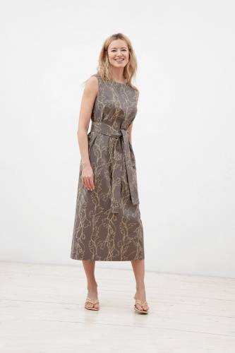 Платье из натурального хлопка с цветочным принтом без рукавов с круглым вырезом горловины. В комплект входит съемный широкий пояс из ткани для создания более приталенного силуэта.