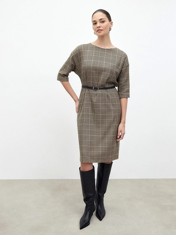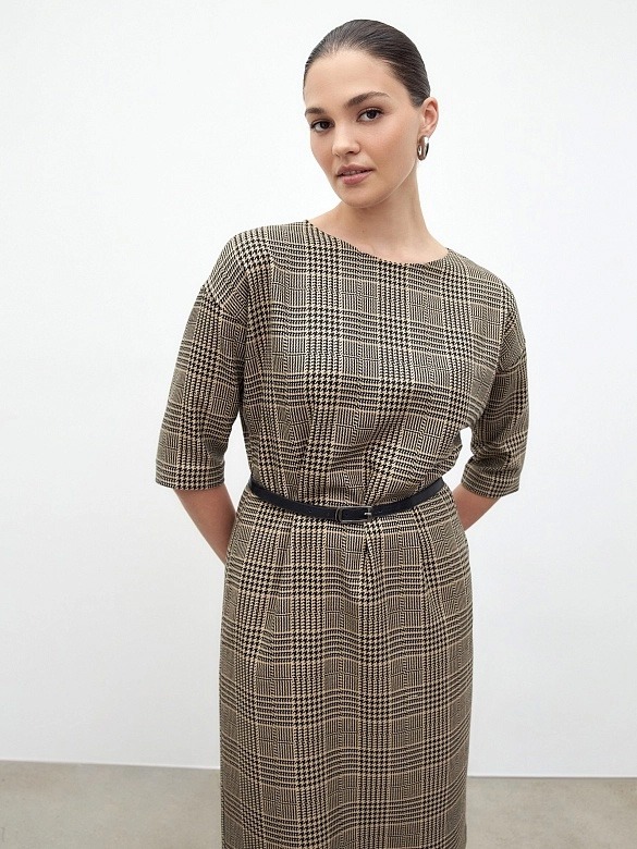 Платье из костюмной ткани в клетку, полуприлегающего силуэта без застежки с горловиной лодочка и спущенным плечом. Пояс фиксирует талию и добавляет мягкие складки. Есть потайные карманы в швах.