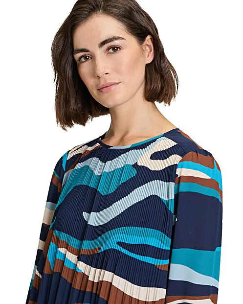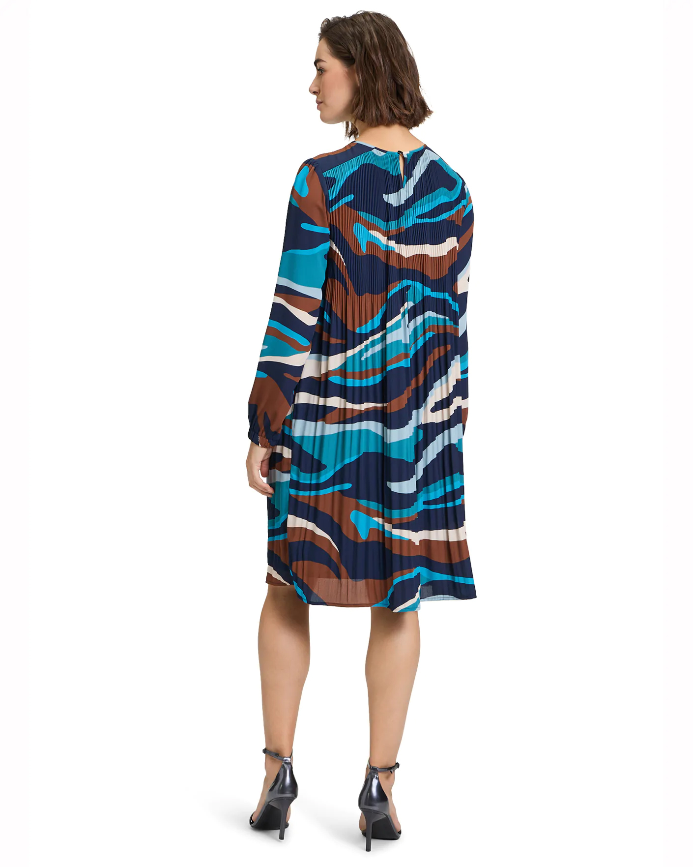 Свободное яркое платье Betty Barclay сине-коричневого цвета в абстрактный принт. Плиссированная ткань на спинке и переде, круглым вырез горловины, застежка сзади на пуговице, длинные рукава с манжетами на резинке в складку.