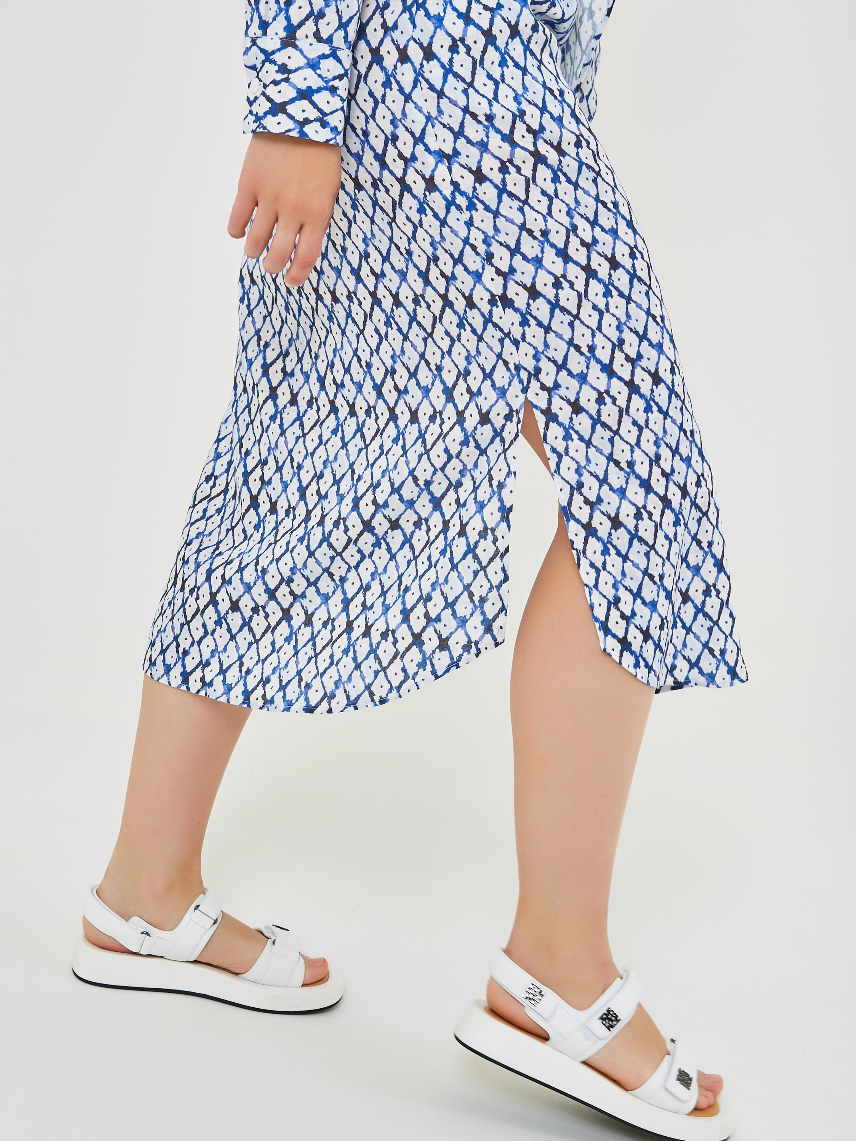 Платье с длинными рукавами и воротником выполнено из легкой ткани с геометрическим узором в синем и белом цветах, что придает ему свежий и стильный вид. Акцент на талии с помощью завязки создает женственный силуэт, идеально подходящий для теплой погоды. Коллекция Весна-Лето 2025. Капсула "Санторини". Параметры модели: 89-70-92, рост 167, размер 44-46