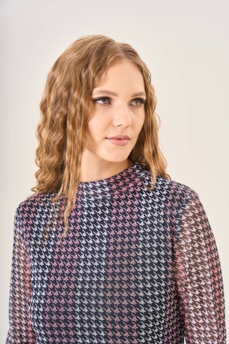 Платье с длинными рукавами и высоким воротником. Элегантный узор "гусиная лапка" в оттенках темно-синего, розового и белого придает образу изысканность и утонченность. Длина платья до середины икры создает гармоничный и привлекательный силуэт. Легкий струящийся материал приятно облегает фигуру, делая этот наряд идеальным выбором для особых случаев и романтических вечеров.