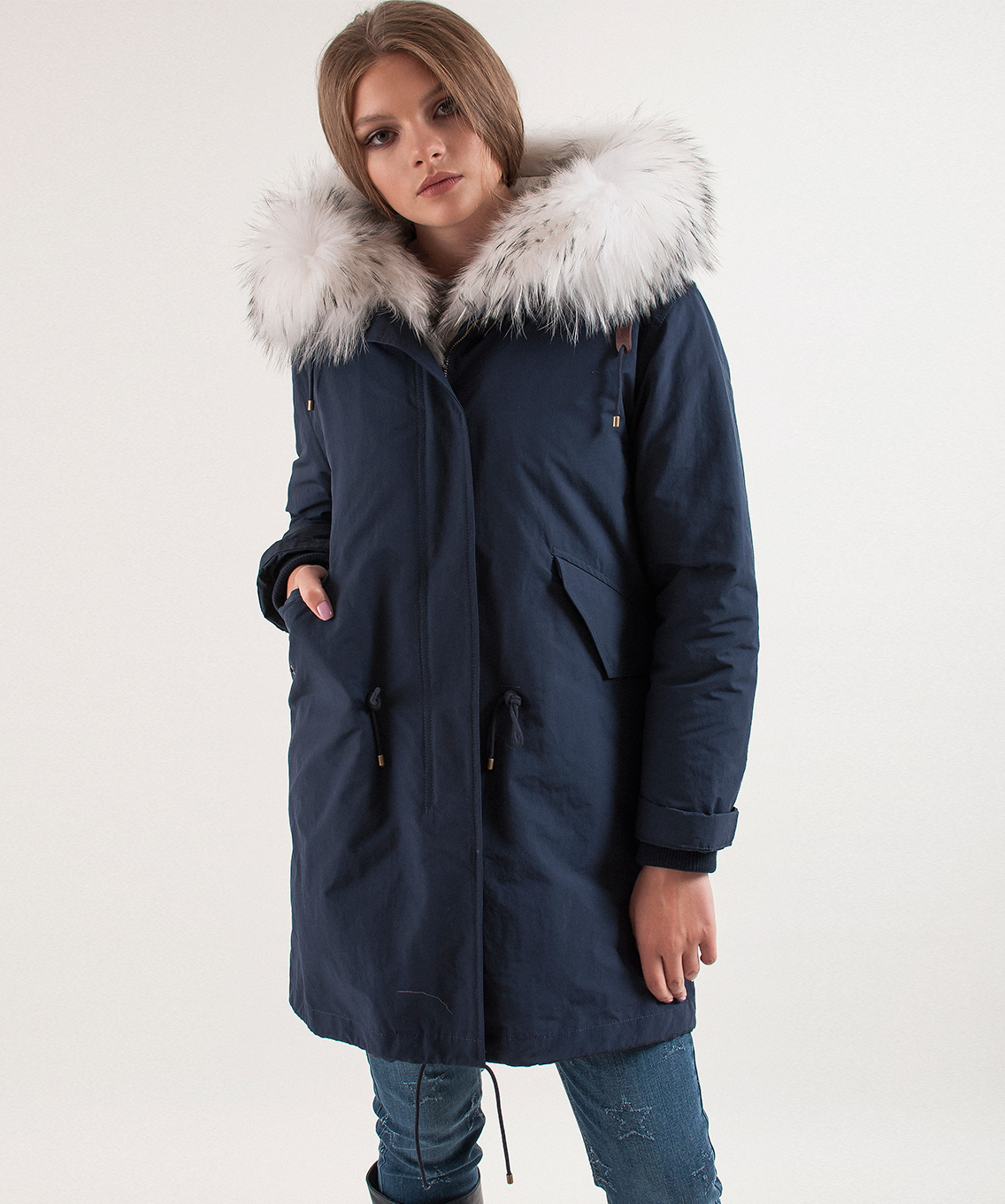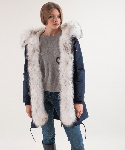 Теплое пуховое пальто. Плотная ткань верха. Прямой покрой, удлиненная спинка, кулиска на талии. Карманы пальто на клапанах. Кулиска по низу изделия. Оторочка капюшона из натурального меха енота.