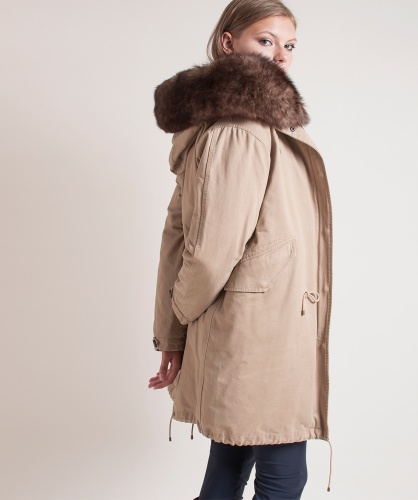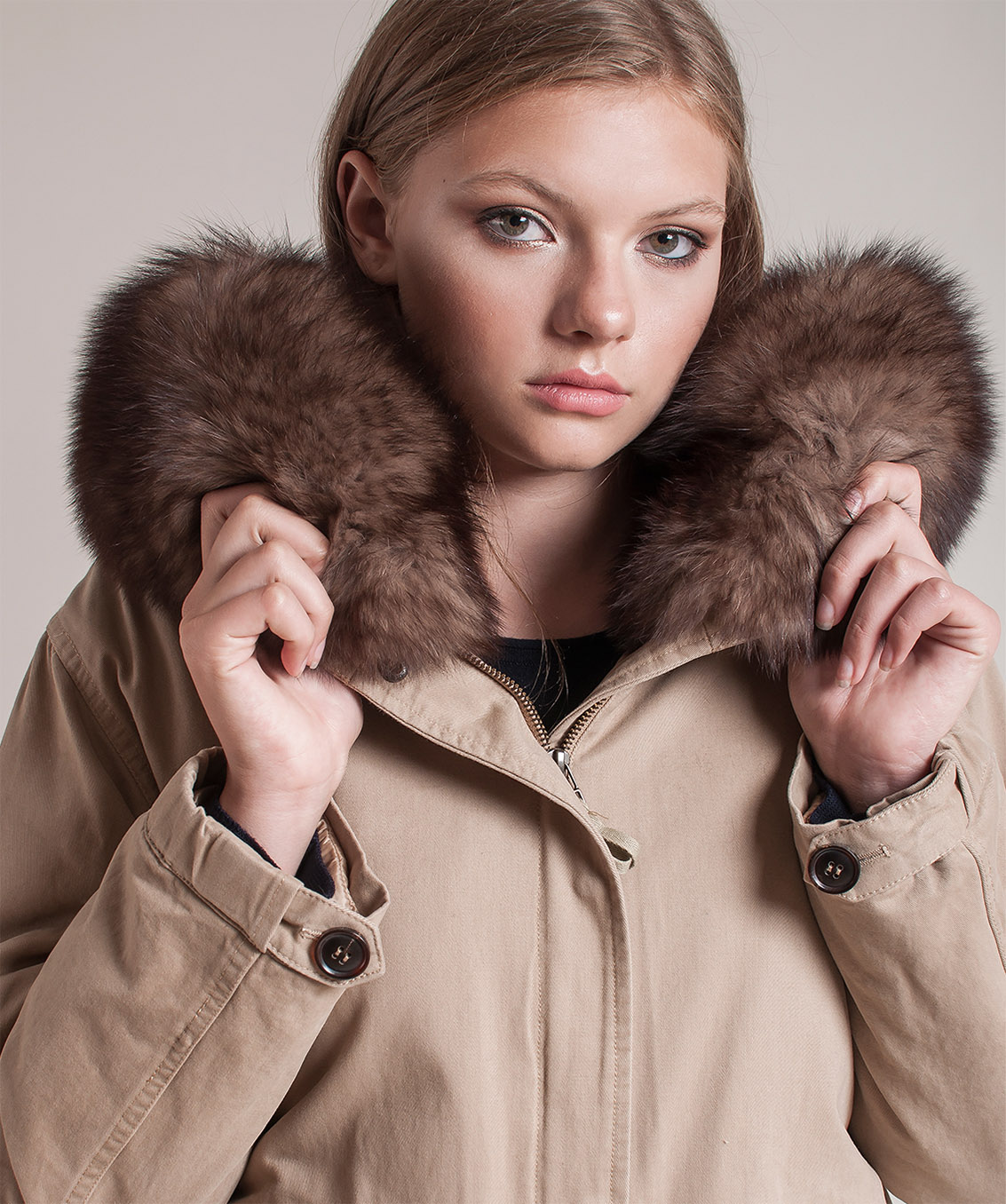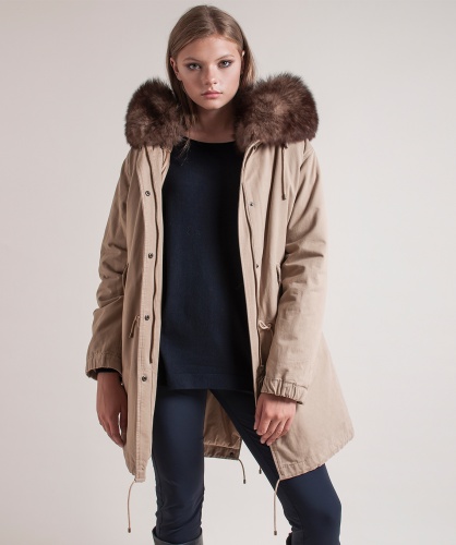 Теплое пуховое пальто прямого кроя. Плотная ткань верха. Кулиска на талии. Карманы пальто на клапанах. Пата с пуговицей по низу рукавов. Кулиска по низу изделия. Оторочка капюшона из натурального лисьего меха.