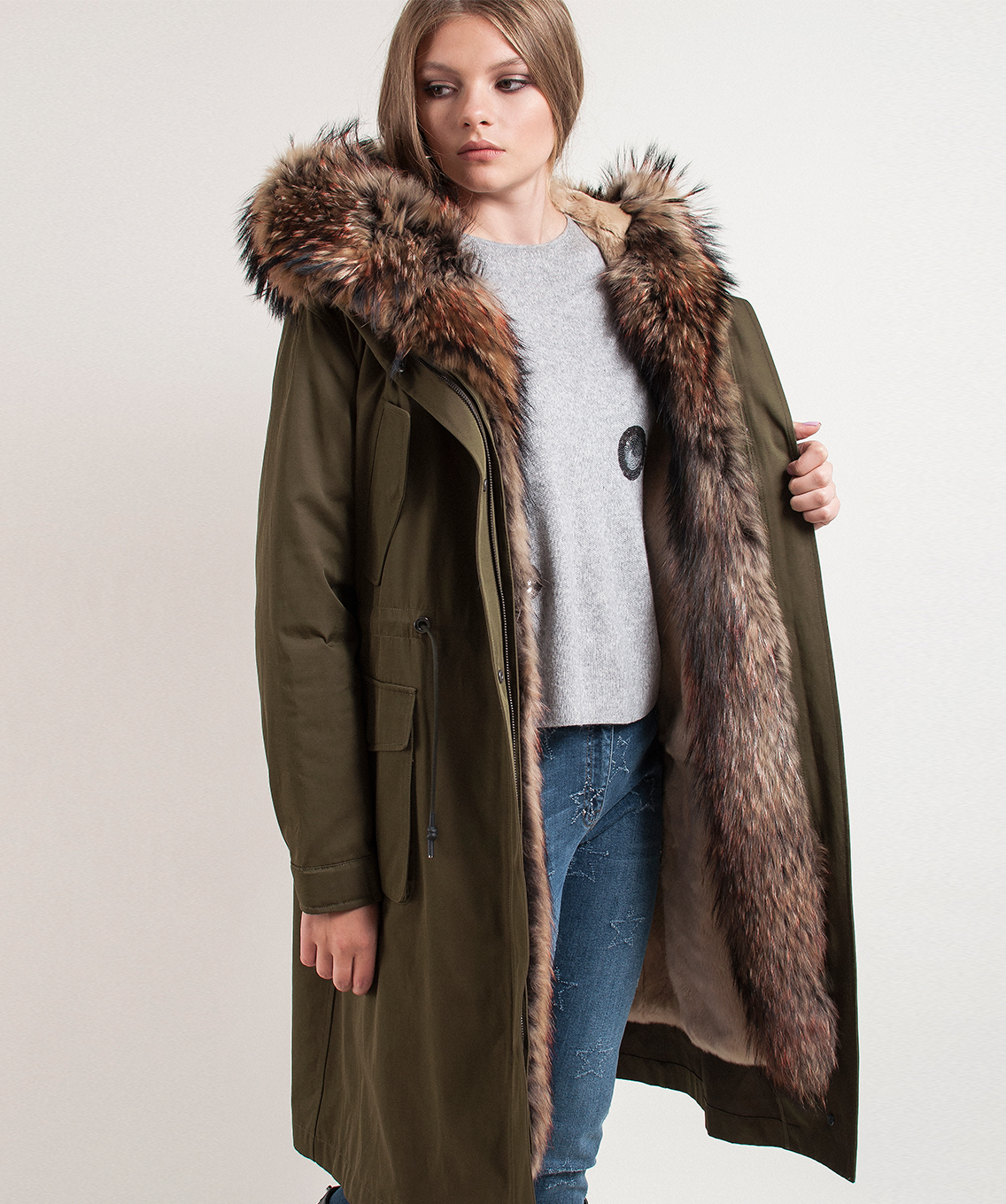 Теплая пихора, подкладка из меха кролика. Плотная ткань верха. Прямой покрой, кулиска на талии. Карманы на клапанах. Рукава оформлены патой на пуговице. Оторочка капюшона из натурального меха енота.