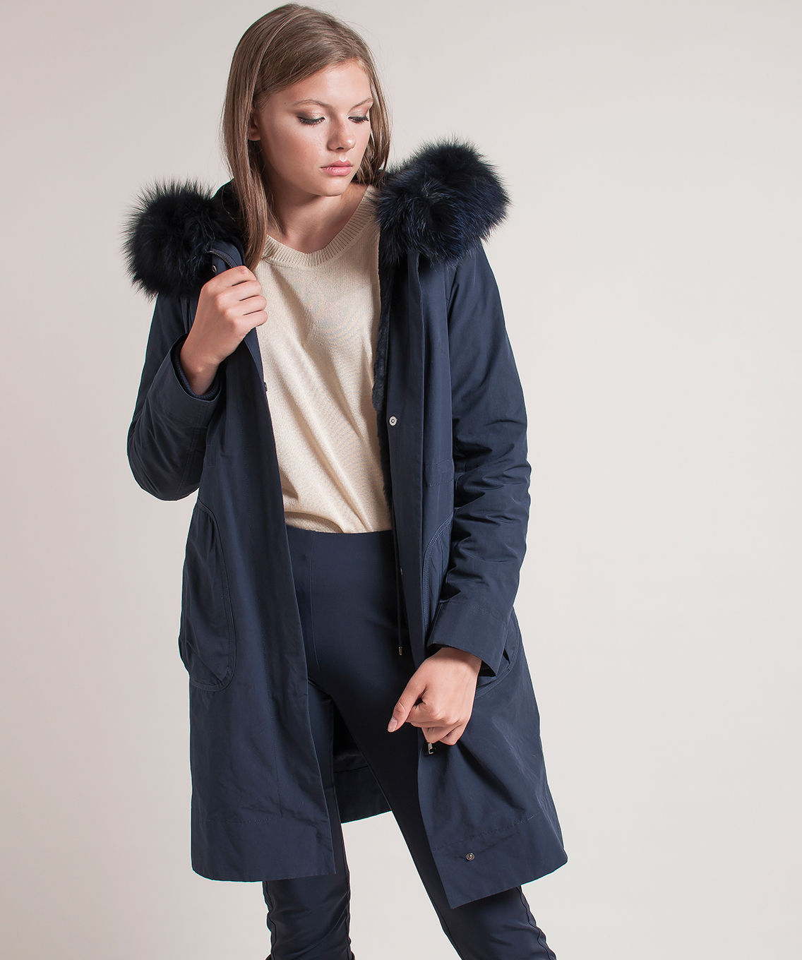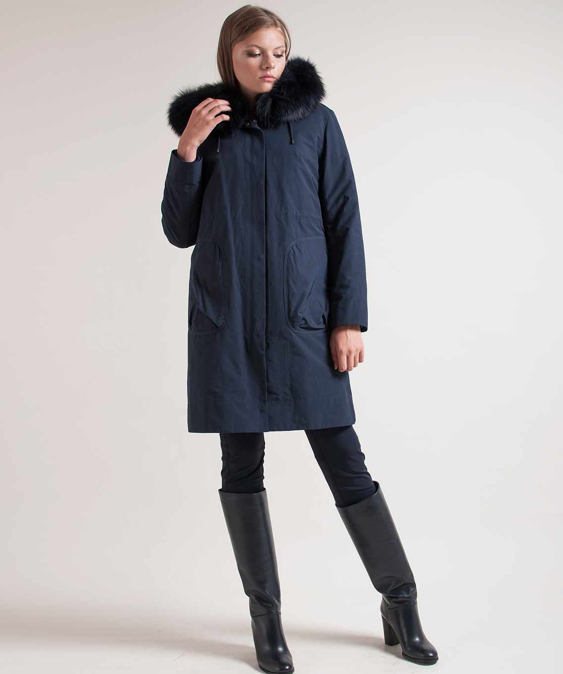 Теплая пихора на подкладке из меха кролика. Плотная ткань верха. Прямой покрой, кулиска с завышенной линией талии. Накладные карманы. Разрезы по бокам. Оторочка капюшона из натурального лисьего меха.