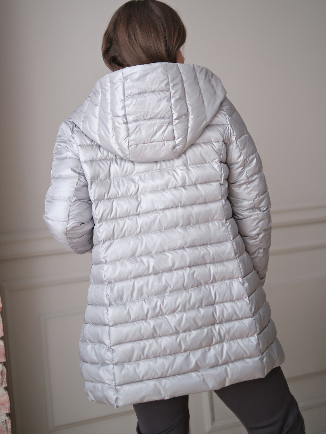 Стеганая однотонная куртка длиной до середины бедра. Глубокий капюшон, боковые карманы на молнии, втачной рукав полной длины. Представлена в синем и серебристом цвете.