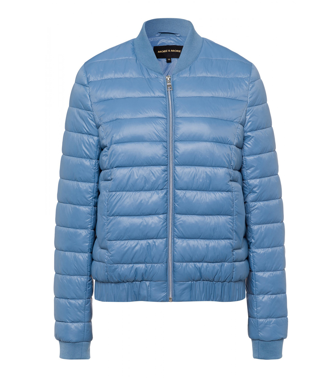 Куртка бомбер небесно голубого цвета станет частью как романтичного, так и спортивного образа. Втачной рукав полной длины с манжетой, воротник-стойка, врезные боковые карманы с листочкой.