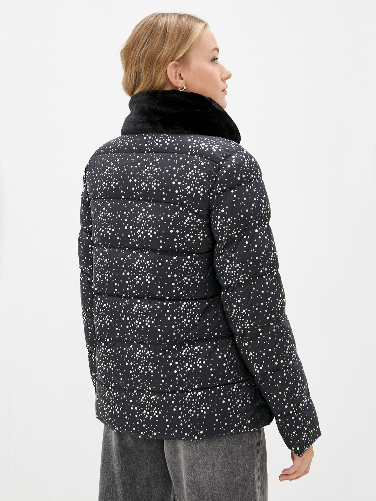 Стеганая куртка без капюшона с синтепоновым наполнителем. Стильный принт по всей поверхности изделия. Прямой силуэт универсален для любого типа фигуры. Воротник-стойка отделан искуственным мутоном. Застежка на скрытую молнию и кнопки. По бокам проперзные карманы с листочкой на кнопке.