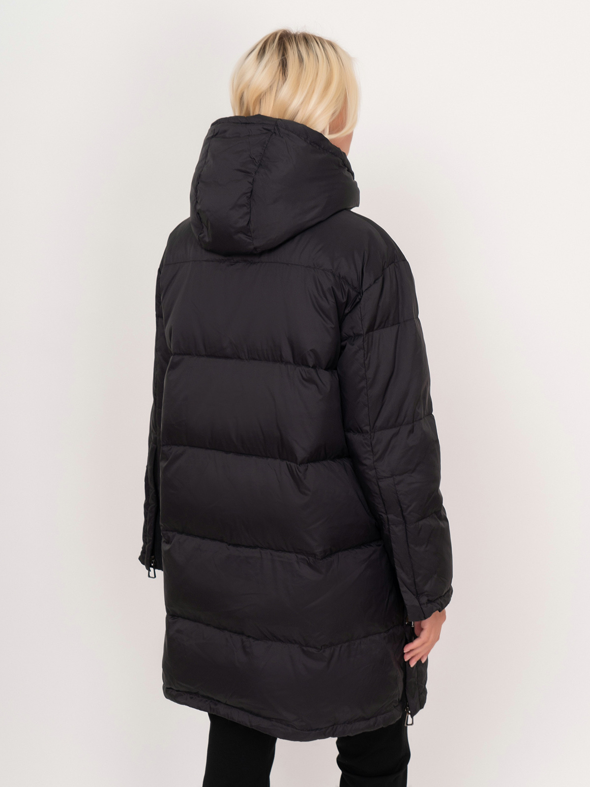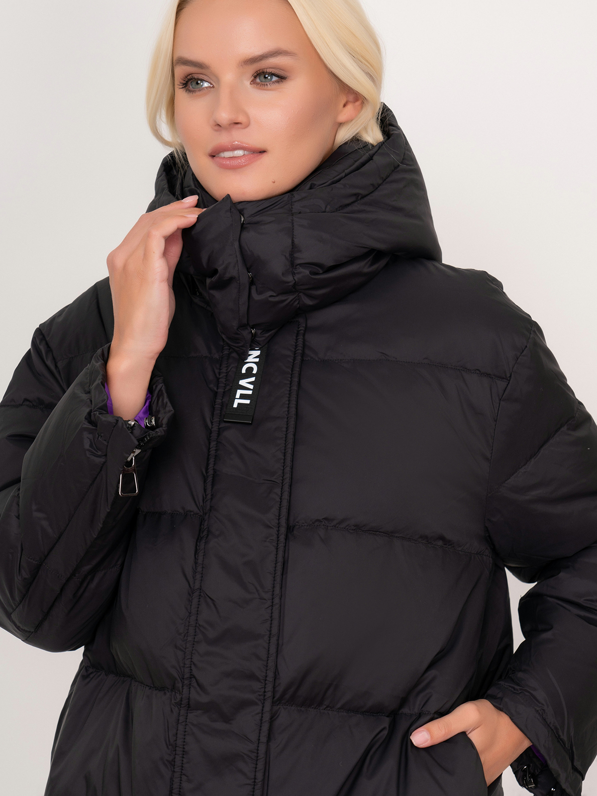 Стеганое однотонное пальто с пуховым наполнителем. Застежка на двойную молнию, ветрозащитная планка со скрытыми кнопками. Объемный капюшон, воротник стойка. Стильный базовый вариант пуховика, хорошо сочетается с различными нарядами.