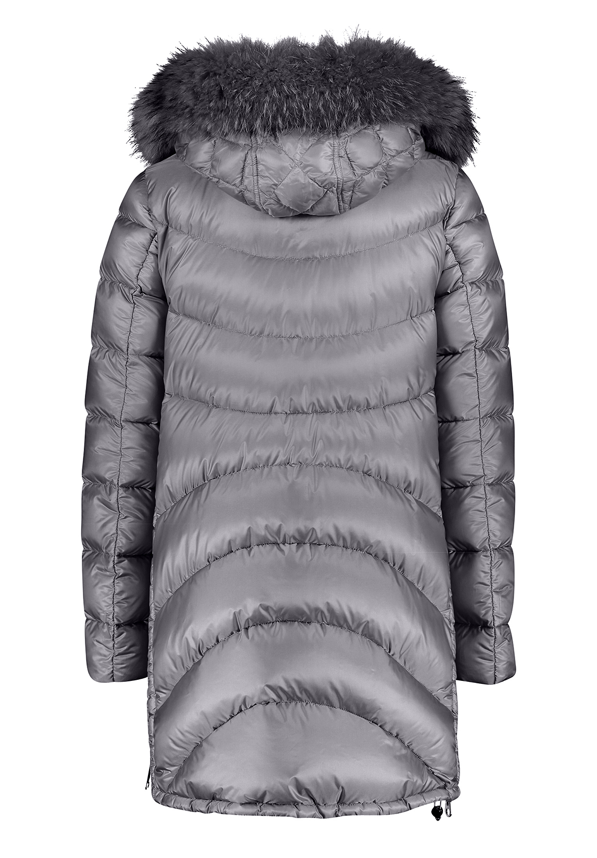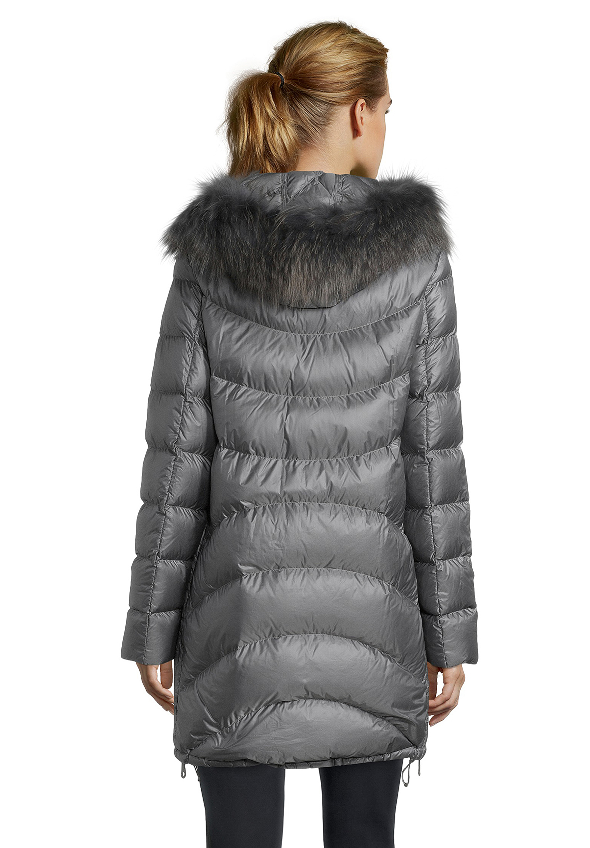 Пуховое пальто прямого покроя. Длина до середины бедра, капюшон на кулиске, двойная застежка-молния, карманы на молниях. Низ изделия на кулиске, что позволяет регулировать прилегание пуховика. Материал верха отлично защищает от ветра и влаги. Отделка капюшона из натурального меха енота придает образу истинный шик.